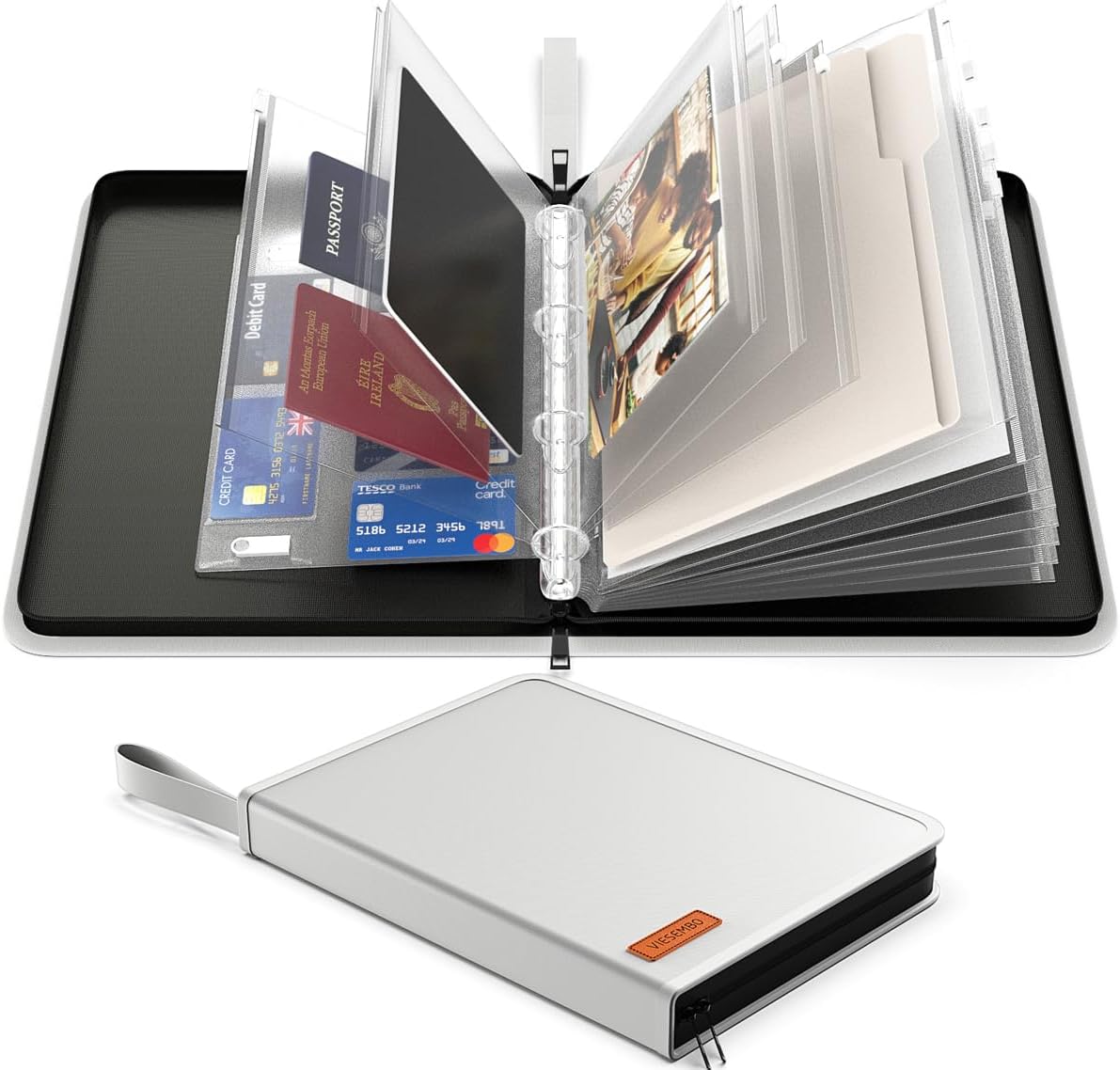 - Binder Pockets: The document holder includes 8 pcs A4 4-holes binder pockets, 4 pcs B5 binder pockets, 1 pcs card slot page holds 6 bank cards and USB