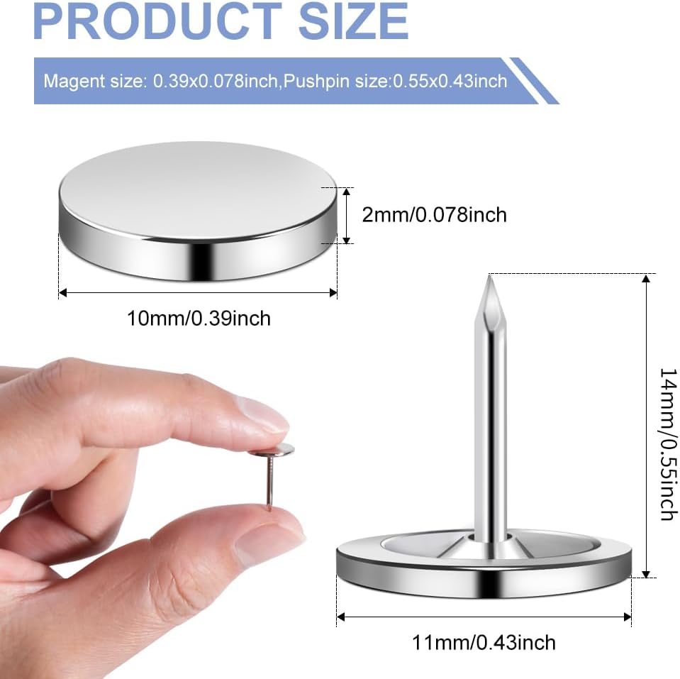 - 【Size】- Magnet Size: 0.39inch * 0.078inch(diameter:0.39inch, height:0.078inch) ,Thumbtack Size: 0.43inch * 0.55inch(diameter:0.43inch, height:0.55inch). The magnetic tack magnet is very strong and does not fall off easily when holding items in place.