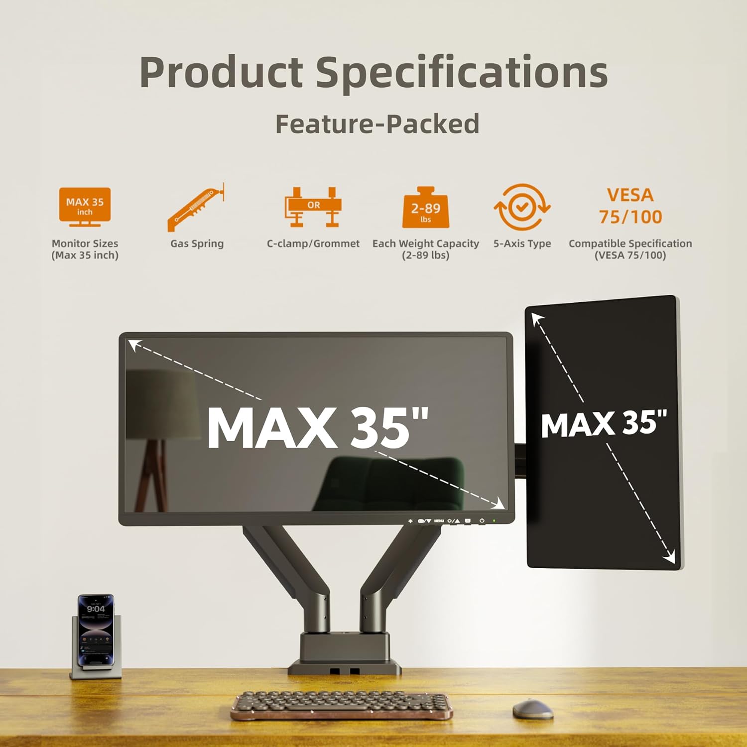 - High load-bearing capacity and compatibility: The Claiks Single Monitor Arm is designed to fit most LCD/LED screens MAX 35", with a maximum load capacity of flat 88.8 lbs or curved 61.6 lbs. It supports standard VESA mounting patterns of 75x75mm and 100x100mm, ensuring compatibility with a wide range of monitors.
