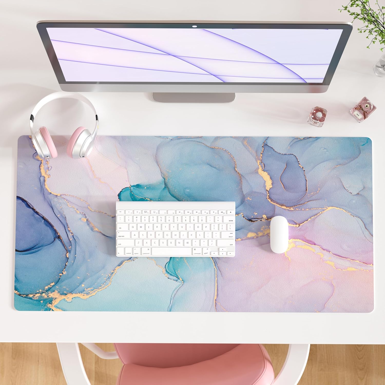 QIYI Large Mouse Pad, PU Leather Desk Mat for Desktop, Waterproof Gaming Desk Pad, Marble Full Desk Accessories Keyboard Mousepad, Abstract Art Home Office Décor 31.5" x 15.7" - Blue Pink Fluid