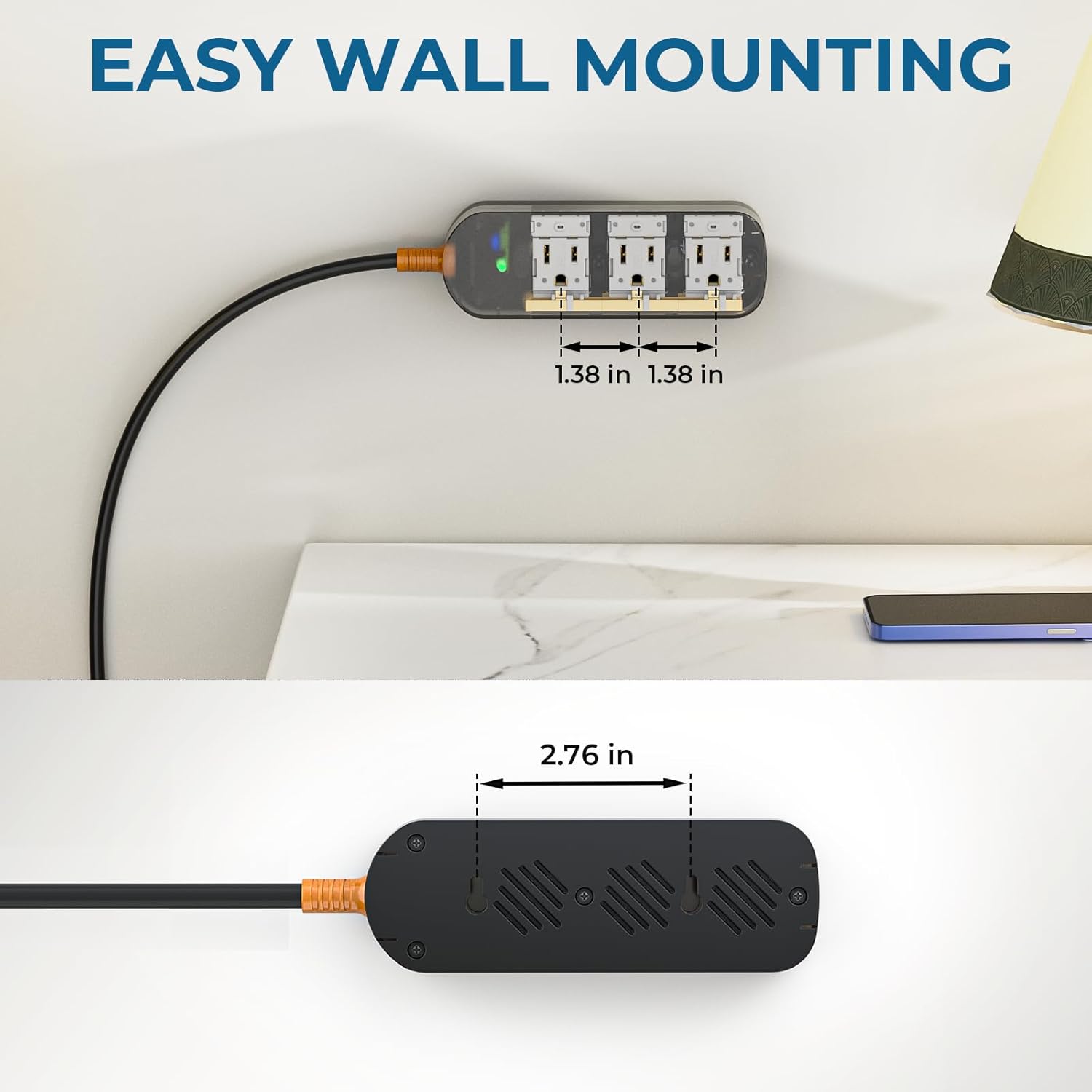 - Multi-Function Power Strips: 45-degree flat plug design saves space against the wall, and the cable swivels 360° for durability.2 keyholes on the back allow you to securely install this surge protector extension cord in various applications, such as workbenches, floor mounts, wall mounts, under counters, dorm room, garage, and more