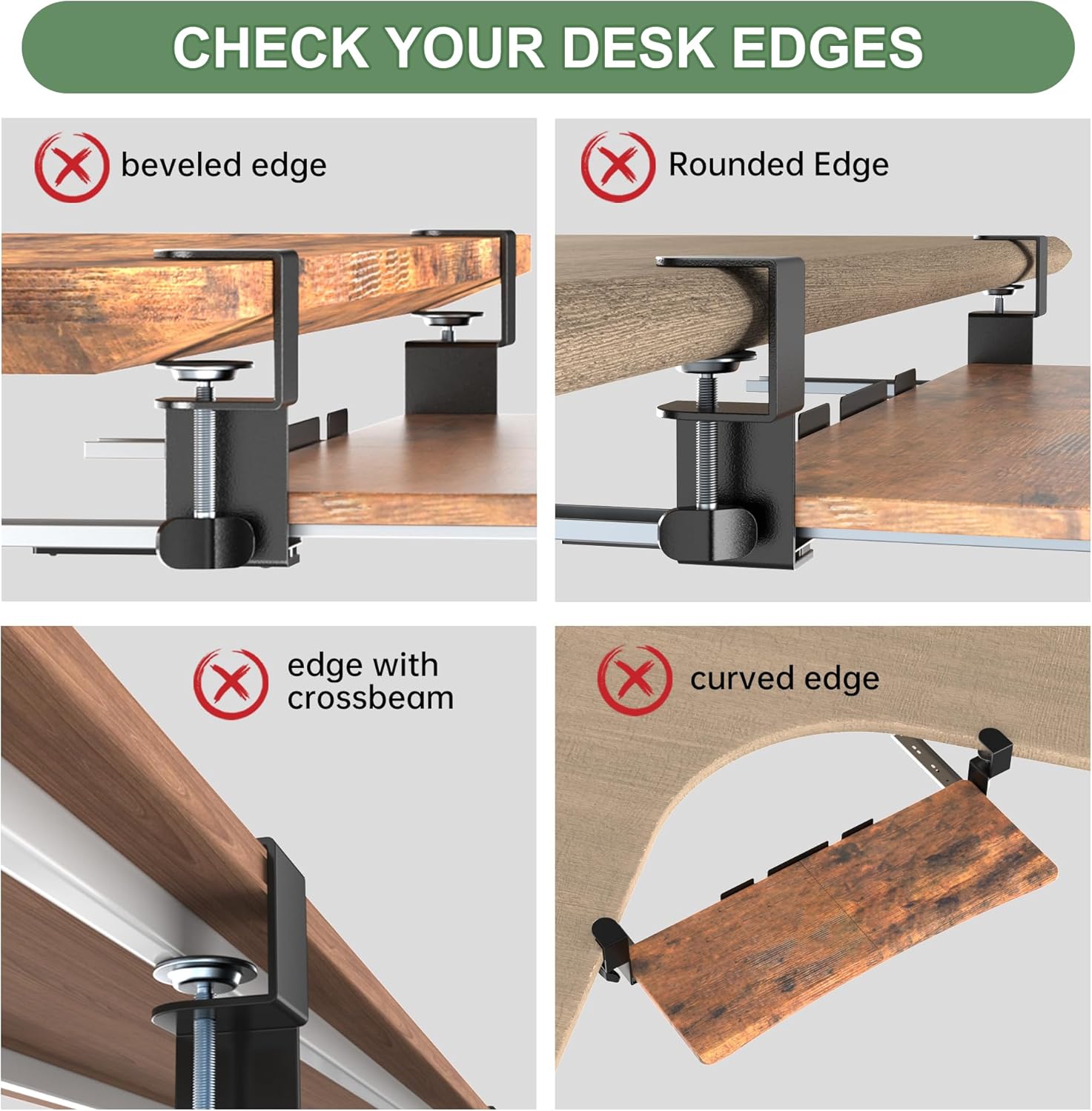 - 【Oversized Surface】 This 31.5” (35.8" including clamps) x 11.8” under-desk keyboard tray fits a full size keyboard and mouse, leaving extra large space for your phone and other small accessories below the desktop, perfect for home offices, gaming stations, and small workspace. PLEASE NOTE: The total length from clamp to clamp is 35.8", so please make sure you have have enough space on your standing computer desk is proper before purchasing. Not be compatible with desktop that have beveled edges.