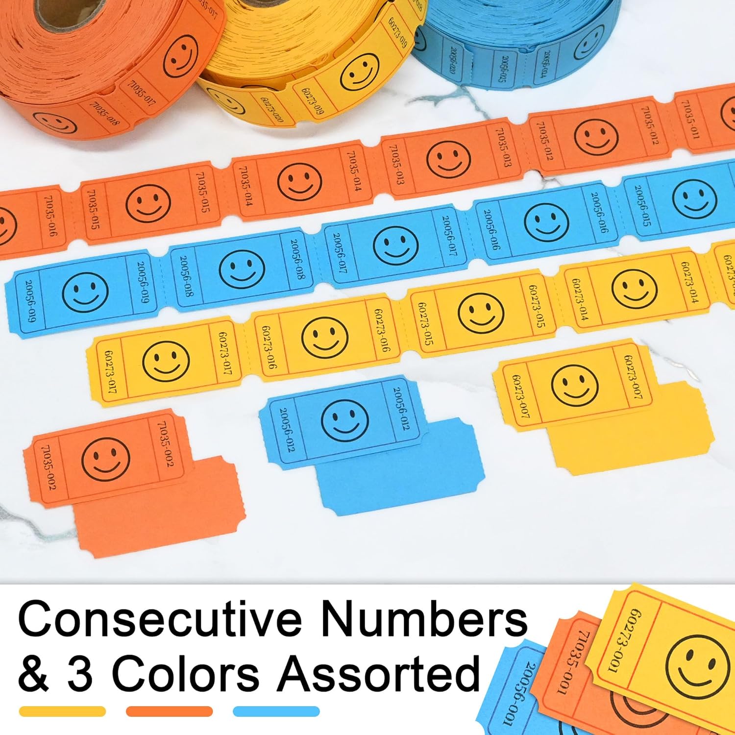 L LIKED 1500 Raffle Tickets Roll, 3 Assorted Colors, 1x2 Inch Smile Ticket for Events, Entry, Class Reward, Parties, Giveaways & Prizes (Yellow, Orange, Blue)