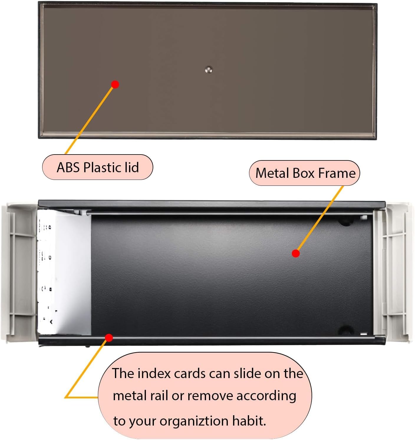 - Index Card Holder: Metal case with with gray plastic lid for durability, includes removable dividers and A-Z letter index tabs for easy organization.