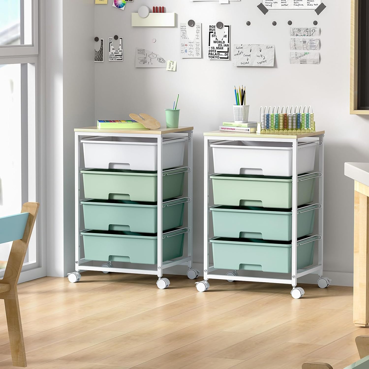 Utility Cart with 4 Drawers,Rolling Storage Cart with Drawers,Storage Rolling Drawer Cart with Wooden Tabletop for Bedroom,Kid's Room,Dorm,Classroom,Office,Green