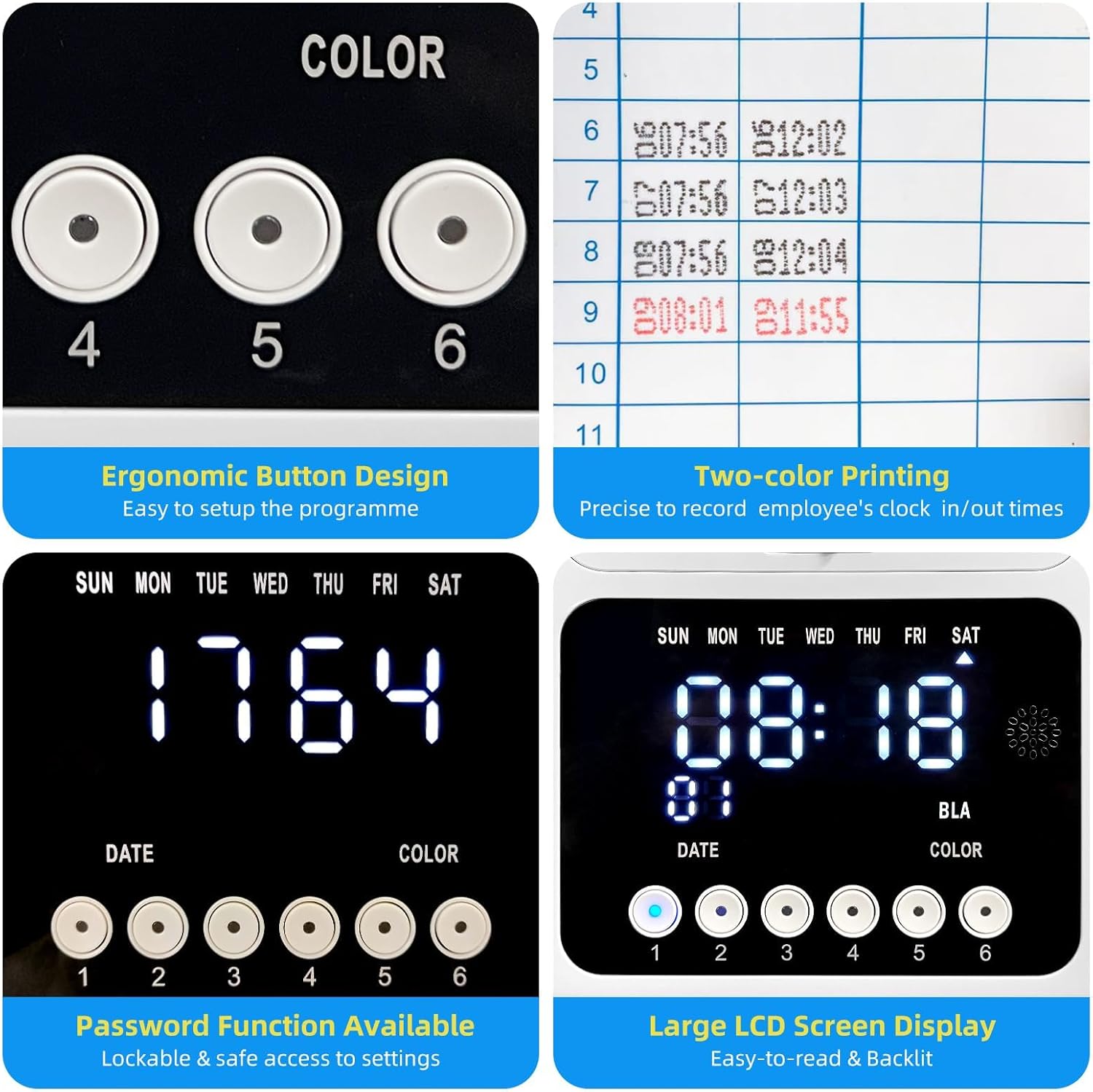 - 𝗨𝗽𝗴𝗿𝗮𝗱𝗲𝗱 𝗦𝗲𝗰𝘂𝗿𝗶𝘁𝘆 - The time clocks for small business can set a password for accessing the setting mode, providing improved safety. The setting buttons are conveniently positioned below the display screen, allowing for easy operation.