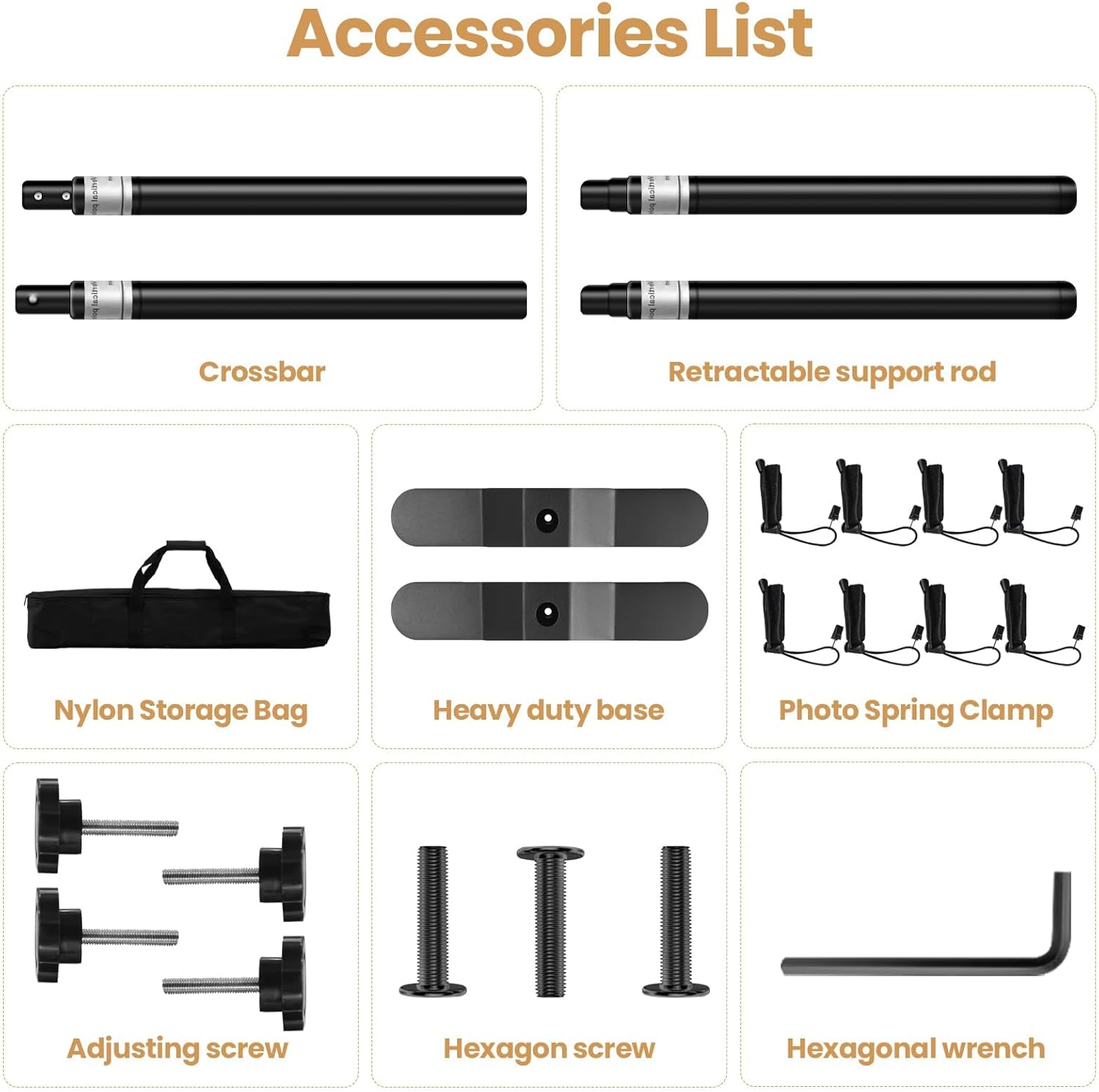 - 【Wide Application】The heavy duty backdrop stand is perfectly suitable for trade show, parties, conferences, promotion banner, weddings, birthday, baby shower, exhibitions, business events and so on. Photography backdrop stand can hang drapes, balloons to make your backdrop amazing, the carrying bag is convenient to store and transport it anywhere with you.