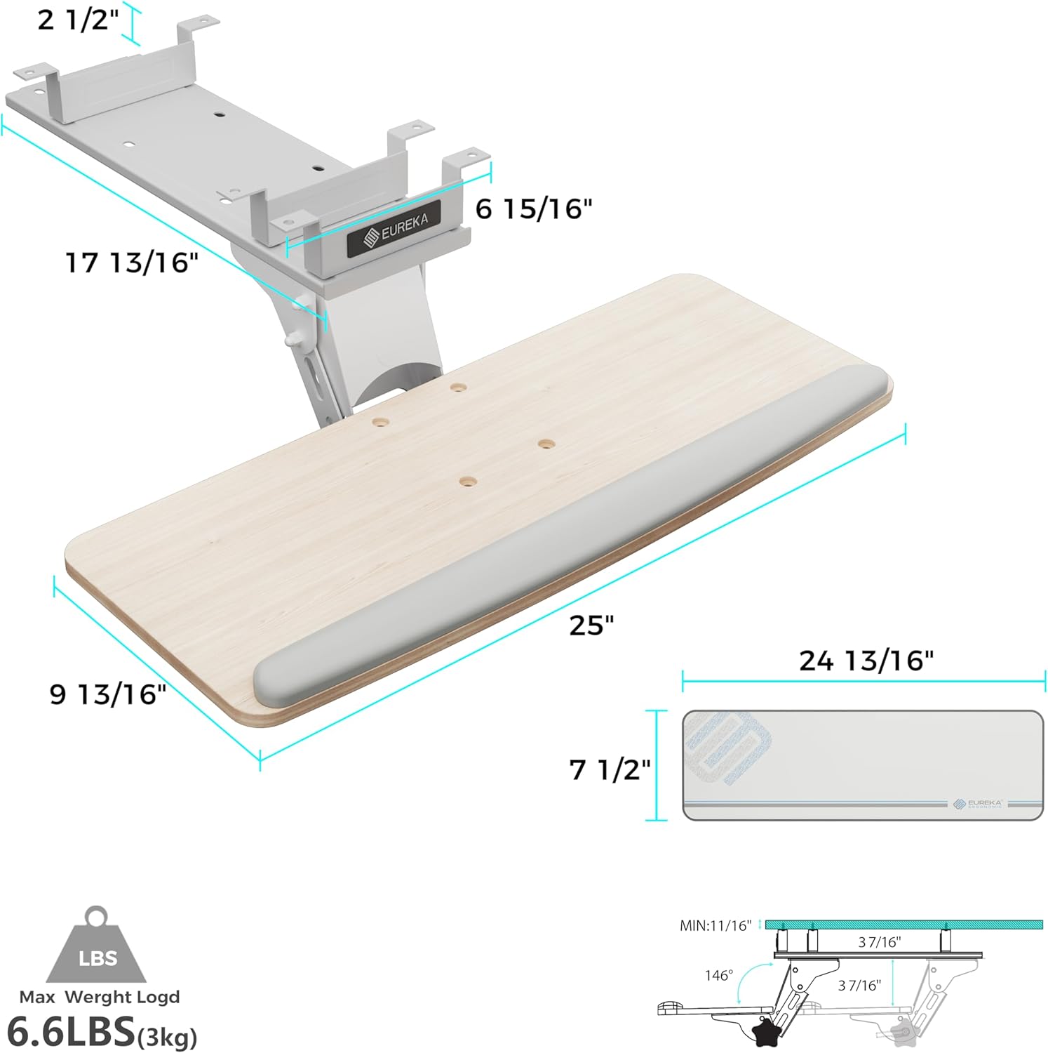 - Perfectly Sized to Free Up Space: The maple keyboard tray for desk measures 25x9.13 inches and fits most keyboards and mice. By sliding the keyboard tray under desk, you can keep your workspace organized and improve desktop space utilization. The pull out keyboard tray can also hold a small laptop, iPad, or other electronics. The mounting bracket is 17.8 inches deep, so make sure your desk is at least 19.69x39.5x29.1 inches (depth*length*height).