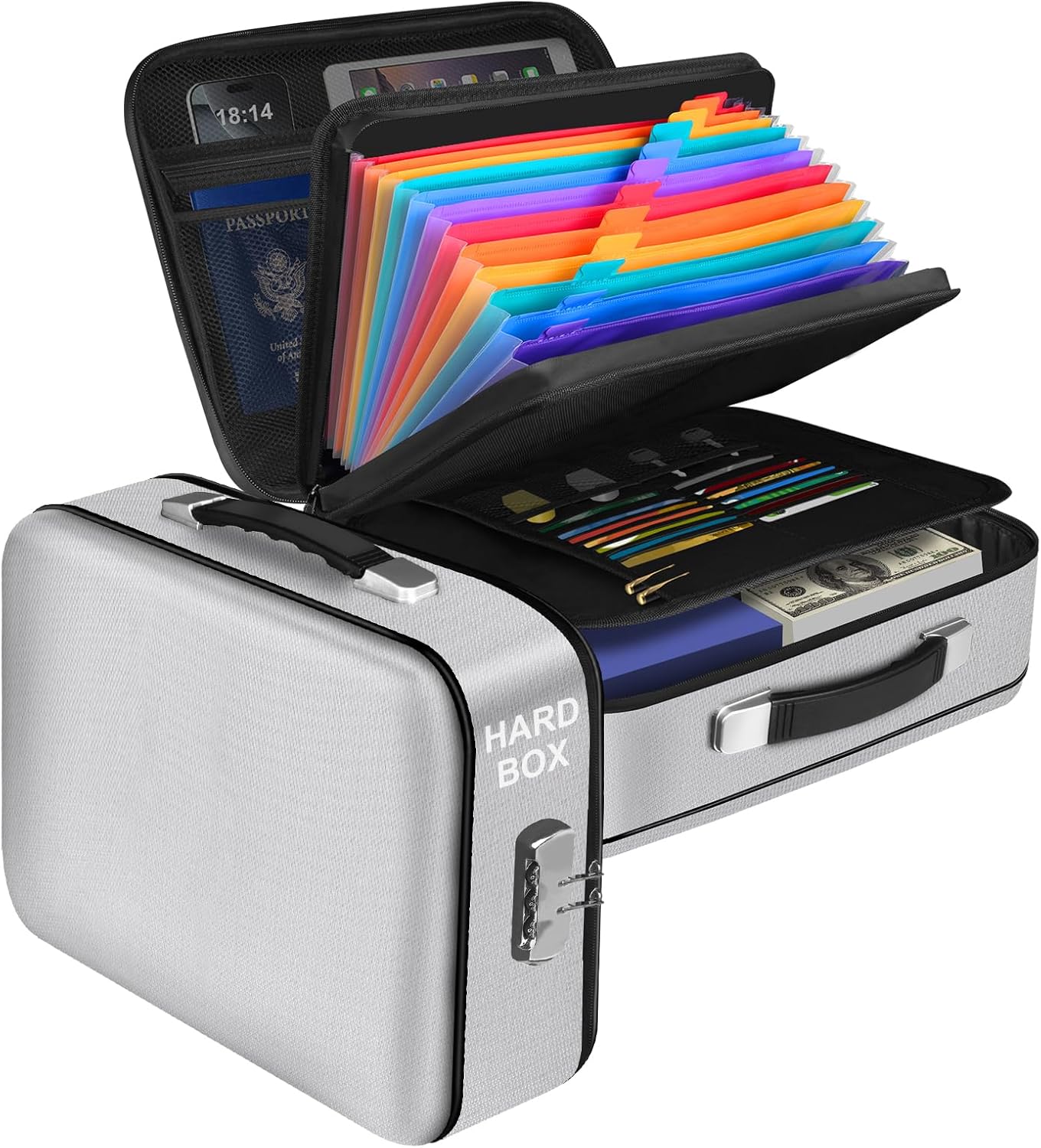 - 【Large capacity,classified storage】: Large Capacity Document Organizer - Outer box dimensions are: 15 x 11 x 5 inches (internal dimensions are 14.4x10.4x4.4 inches) with multi-layer classification design, Includes 1 large storage compartment with unlockable elastic band, 1 main mesh pocket with zipper, 2 certificate passport mesh pockets, 14 card slots, 3-layer middle mesh pockets, 4 USB flash drive pockets, 12 accordion pockets. There is enough space to classify and store important documents, laptops, cash, passports, USB, birth certificates, cards, helping you quickly find what you need.
