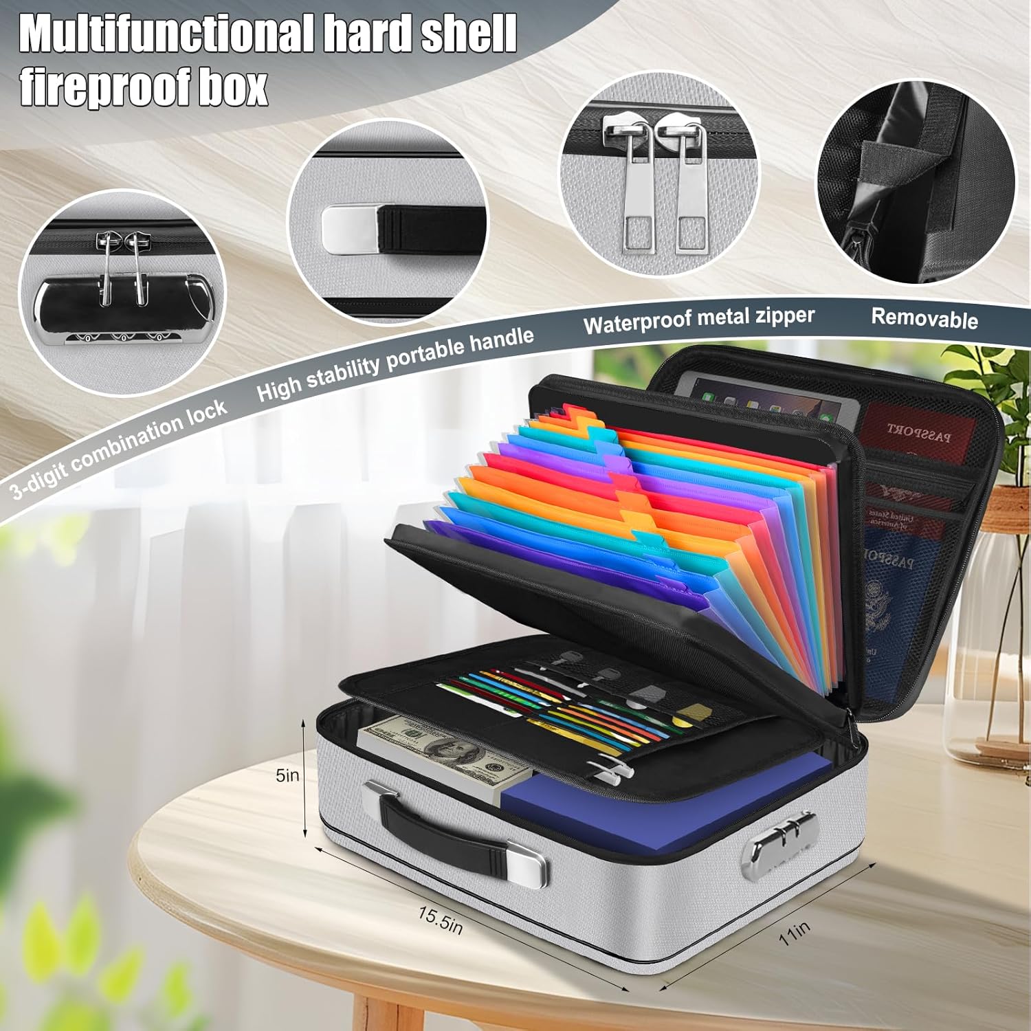 - 【Multiple safety details design】: Fireproof Document Box adopts mechanical password lock design, which can provide you with a safe storage solution. The zipper adopts water Resistant design to protect important documents to the greatest extent. The upgraded portable metal handle is lighter and more beautiful, making it easier to carry in an emergency, It also has two anti-skid pads at the bottom to improve stability and facilitate storage.Suitable for daily life, home office travel, and also very suitable as a gift for family and friends.