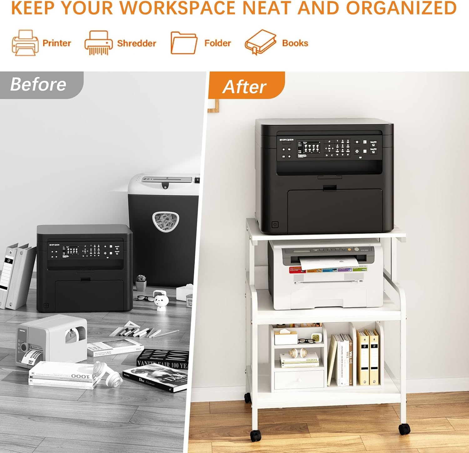 - 【Large Storage Space】:This 23.6 x 18.9 x 29.5 inches printer cart features 3 layers of ample storage space. Can be used to store printers,scanners,fax machines as well as documents,books,stationery,printer paper,etc., is the perfect way to keep your office clean and tidy!