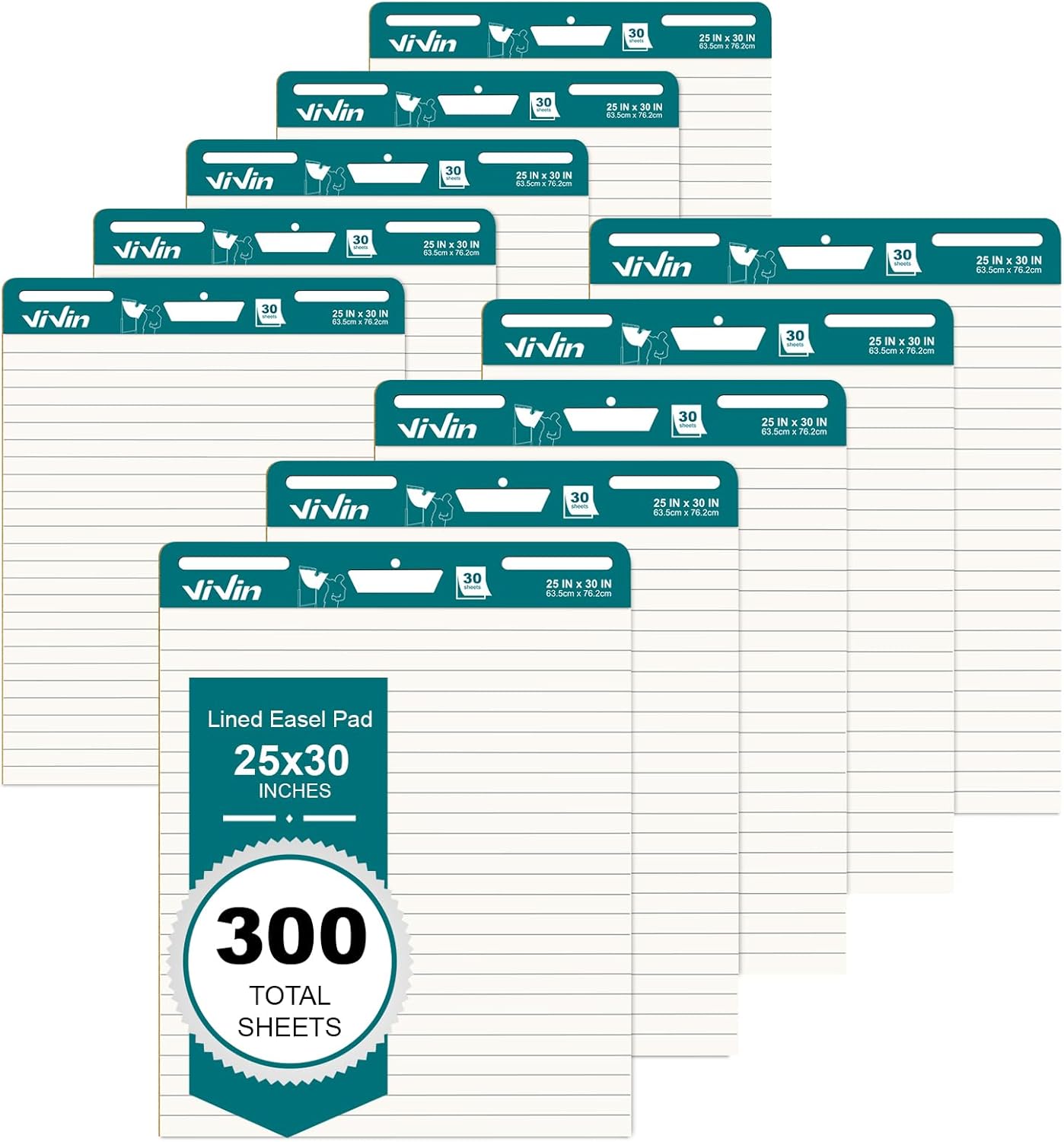 ViVin Lined Sticky Easel Pad, 25 x 30 Inches Flip Chart Paper for Teachers and Students, Large Self Stick Easel Paper, Teacher Anchor Chart, 30 Sheets/Pad, 10 Pads/Pack