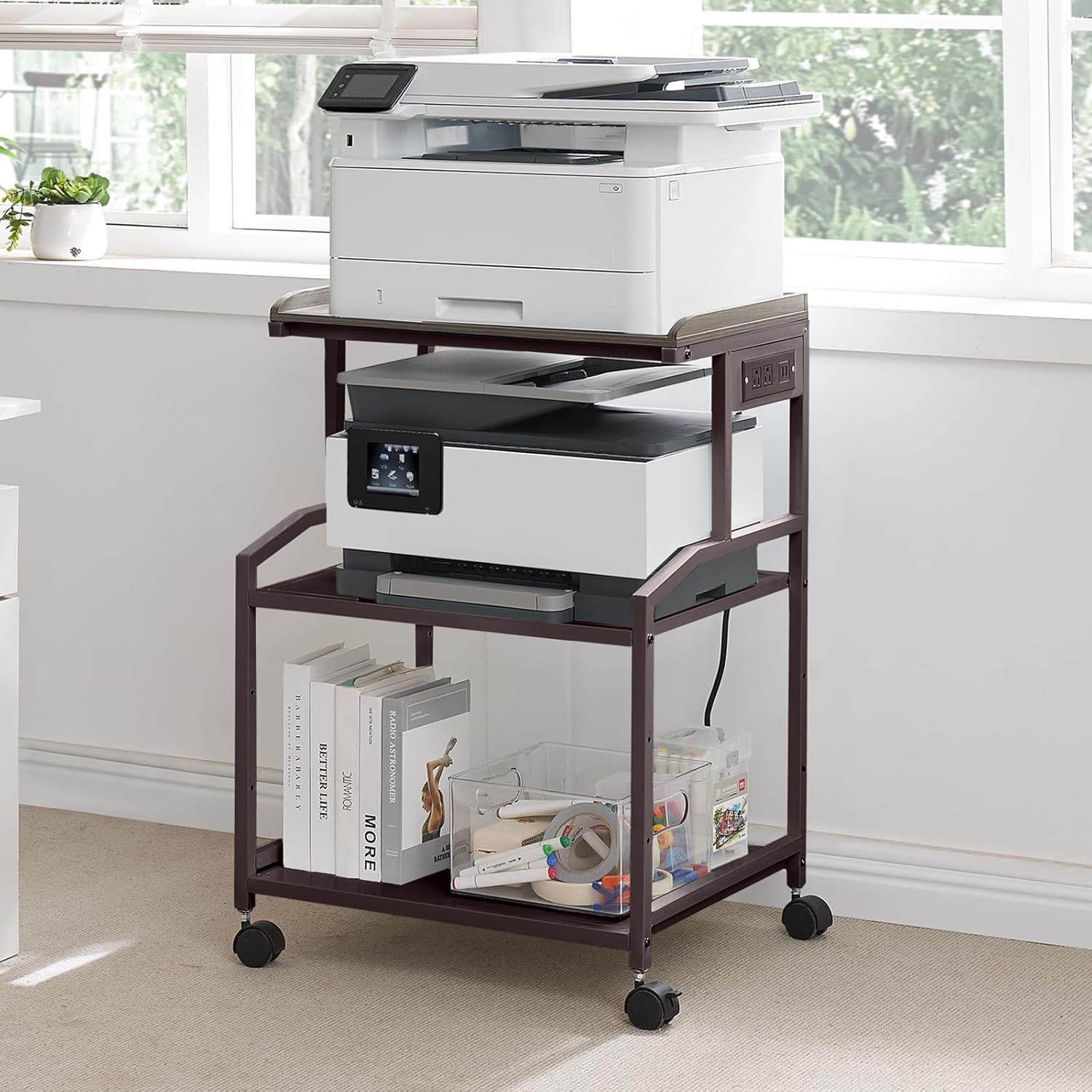 Lauren&Harold 34'' Printer Stand with Power Outlets & USB Ports, 3-Tier Adjustable Rolling Cart, Heavy Duty 150LBS Storage Table with Wheels for Office, Kitchen, Living Room, Bronze