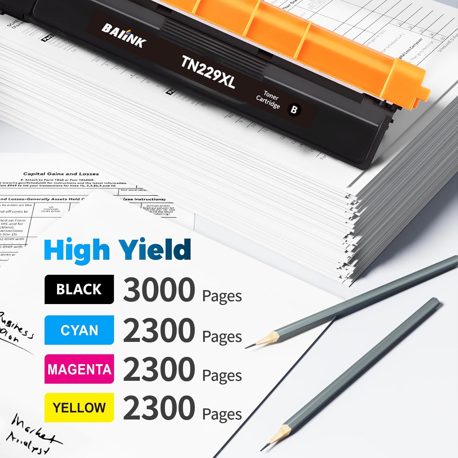 - Package Contents: 1 x TN229XL black, 1 x TN229XL cyan, 1 x TN229XL yellow, 1 x TN229XL magenta