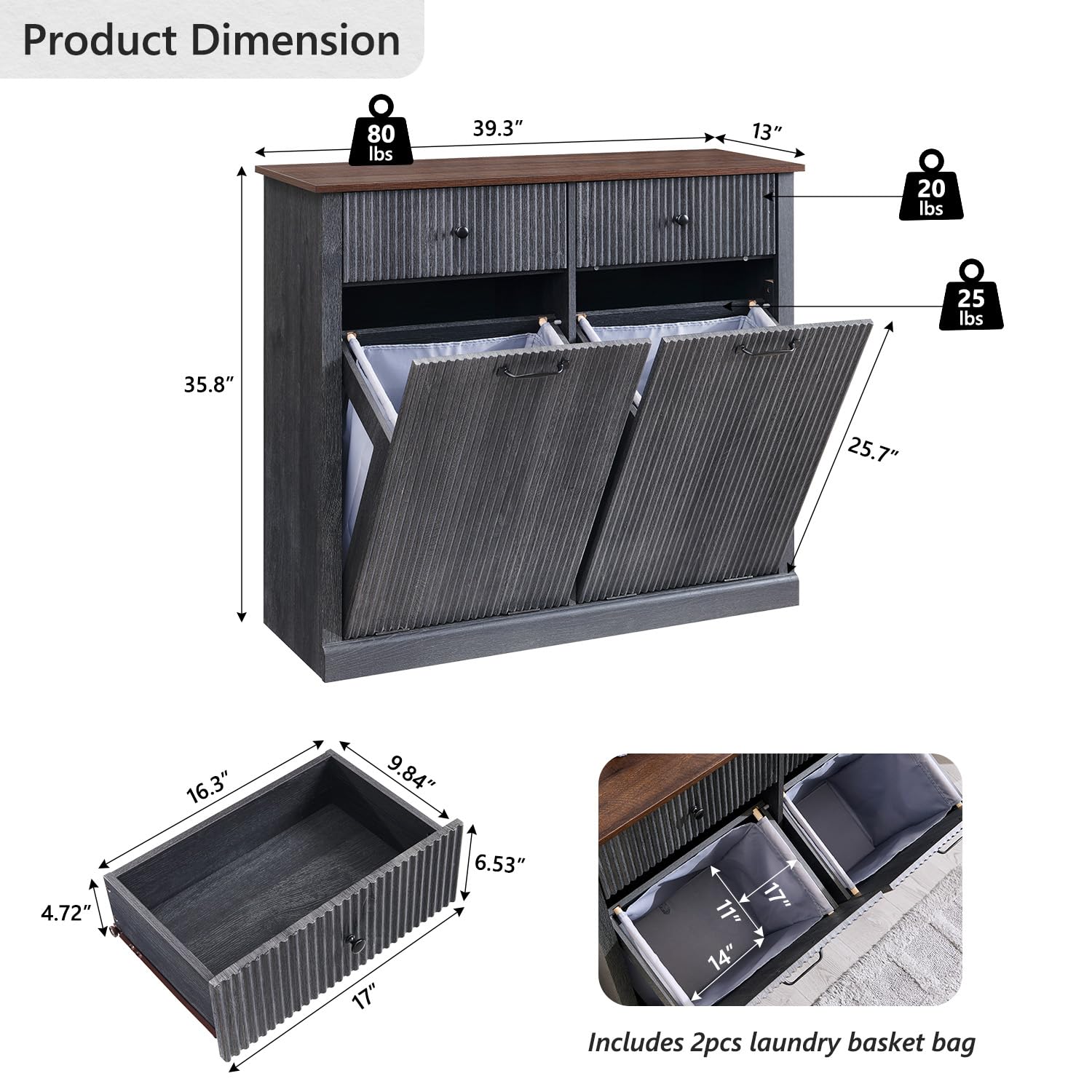 Modern Double Tilt-Out Trash Cabinet, 20 Gallon Fluted Laundry Hamper Cabinet with 2 Drawers, Wooden Hidden Garbage Can Cabinet with Storage Basket, Free Standing for Kitchen & Living Room, Grey