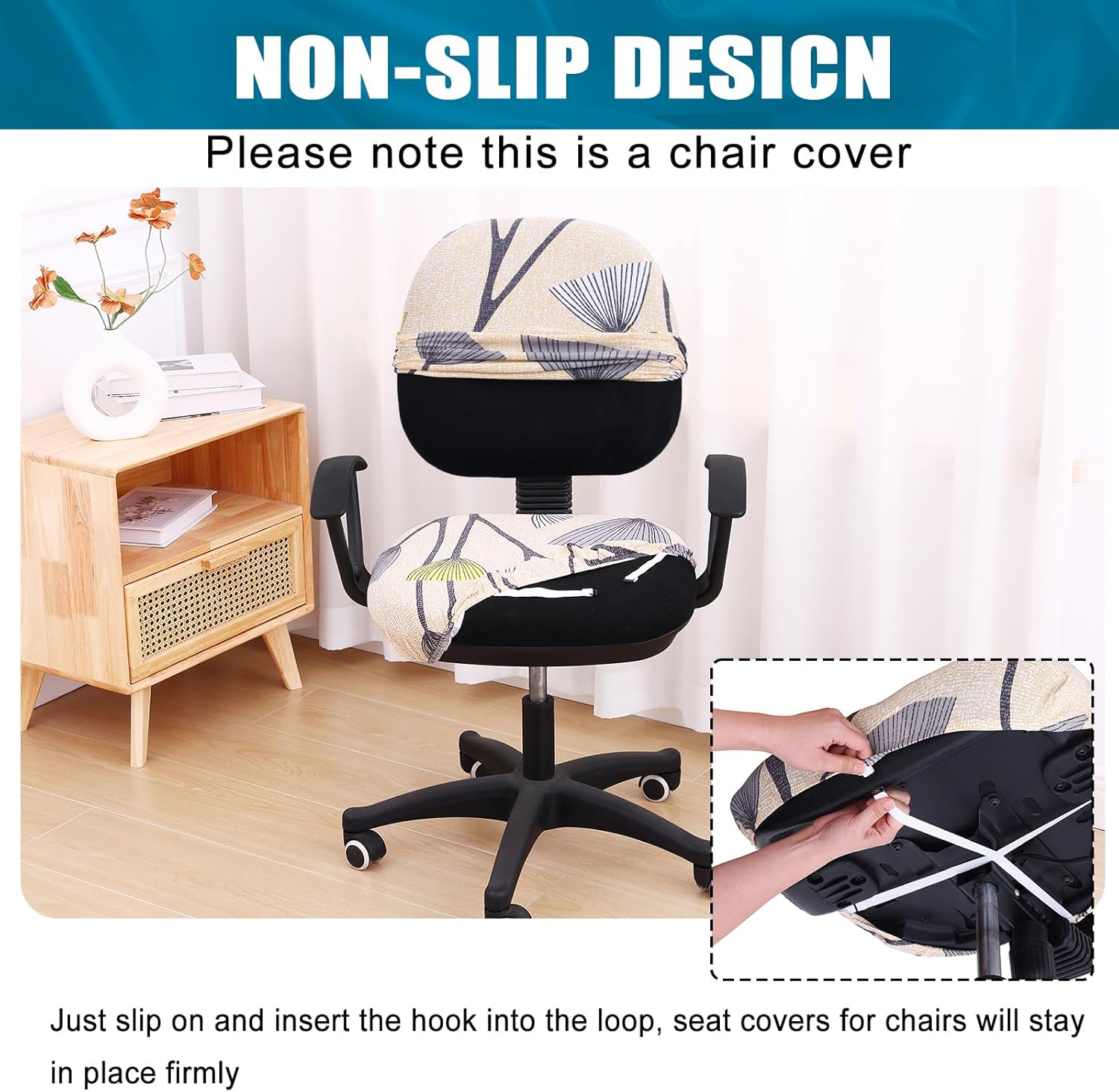 - [Non-Slip Design] This stretchy desk chair cover is equipped with elastic band with hook for faster installation and anti-slip, providing a secure fit. Just slip it on, pass the straps thread the bottom of the chair and hook the hook into the loop, seat covers for chairs will fit snugly around the chair