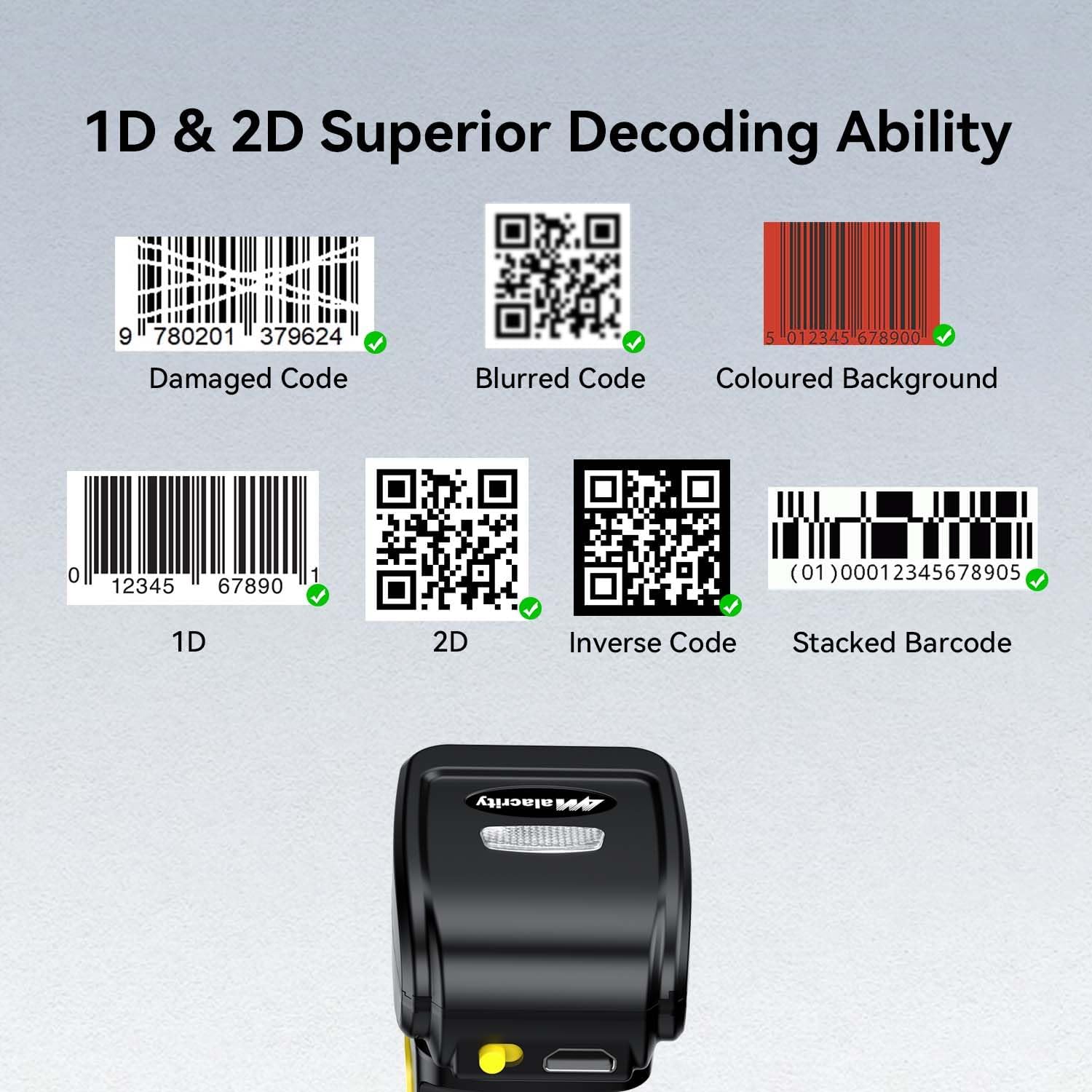 - 【High-Speed and Precise Scanning】 The Alacrity scanner is designed to quickly and accurately capture a wide variety of 1D and 2D barcodes: 1D Barcodes: UPC/EAN, Code 39, Interleaved 2 of 5, Code 93, Code 128, Codabar, Industrial 25, Matrix 25, and more. 2D Barcodes: QR Code, Data Matrix, PDF417, Aztec Code, Maxicode. Thanks to its superior decoding technology, it easily scans damaged, misprinted, colorful, or reflective barcodes. It can also scan barcodes displayed on smartphone or computer screens, not just printed ones.