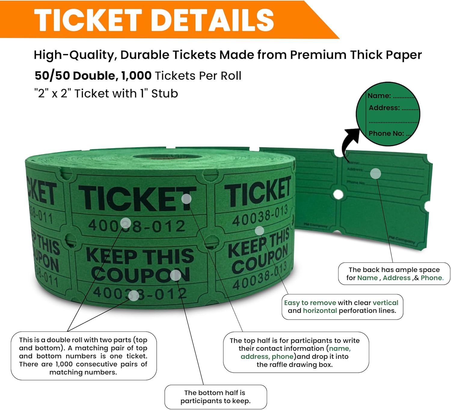 - Rolls of Green 1000 double stub raffle tickets with consecutive numbering, designed with perforated lines for easy separation, saving you time and effort.