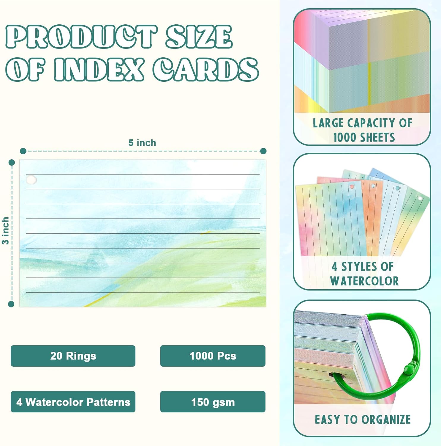 1000 PCS Colored Index Cards with Hole Lined Flash Cards with Binder Rings Watercolor Notecards with Rings 3x5 Study Cards Flashcards for Home School Office Supplies