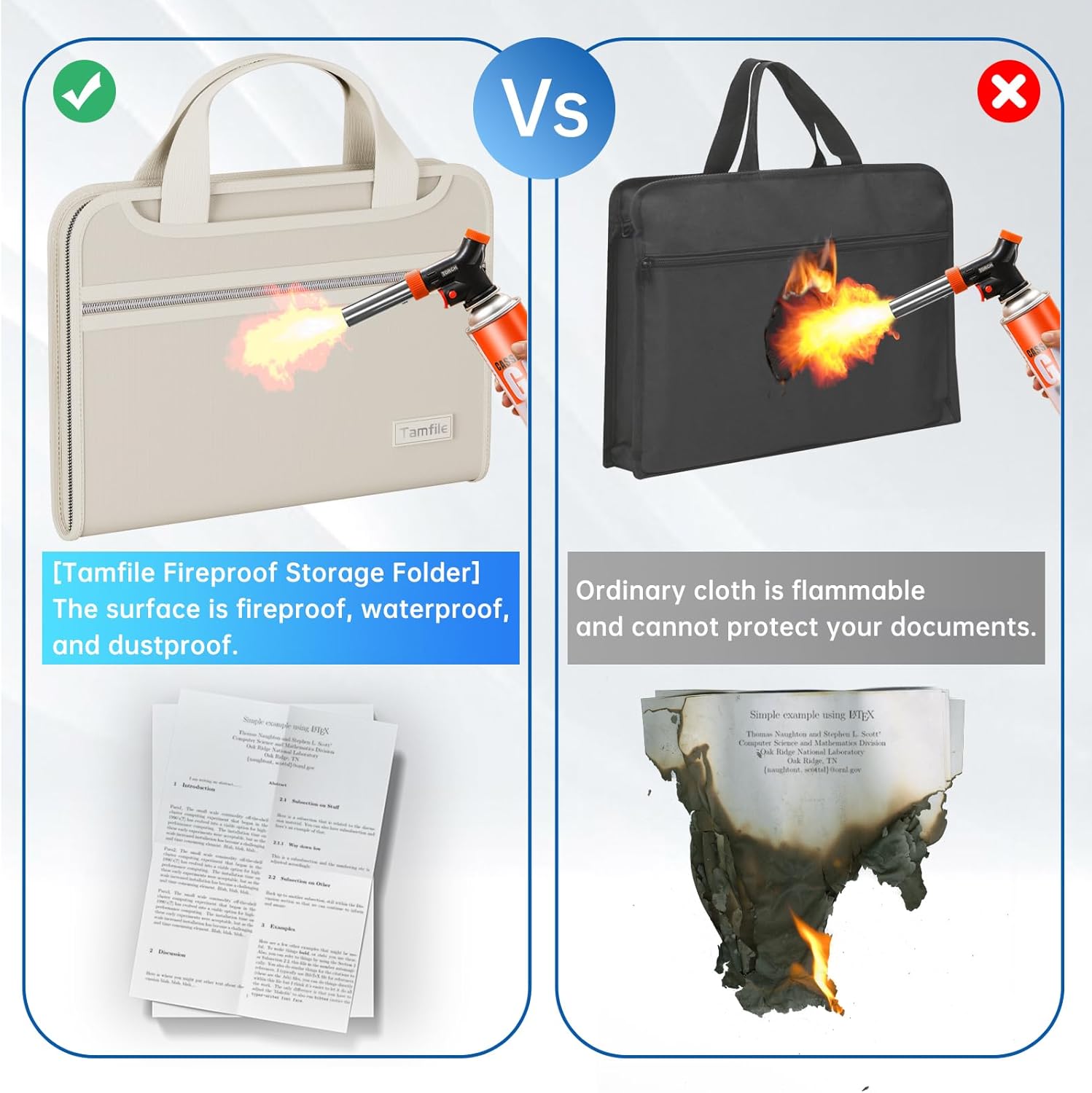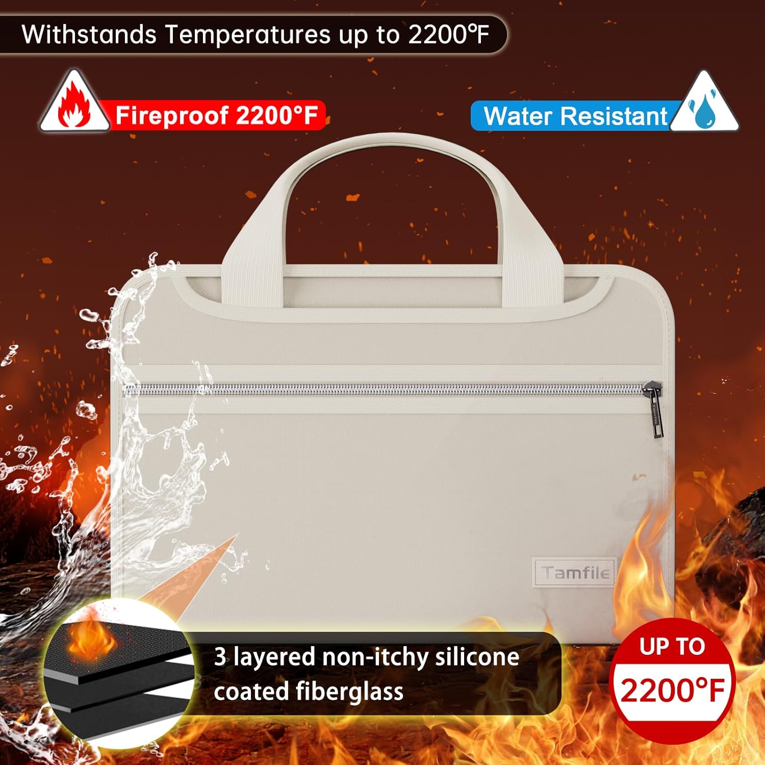 - Tamfile Fireproof Storage Folder: Fireproof, Waterproof, Dustproof. The folder surface is made of upgraded silicone glass fiber fabric with fireproof and waterproof properties, capable of withstanding temperatures up to 2200°F and passing SGS testing (UL94 certification).Fireproof multifunctional folders are suitable for storing and organizing your valuable materials certificates, birth certificates, important documents, office supplies, picture albums, drafts, etc.