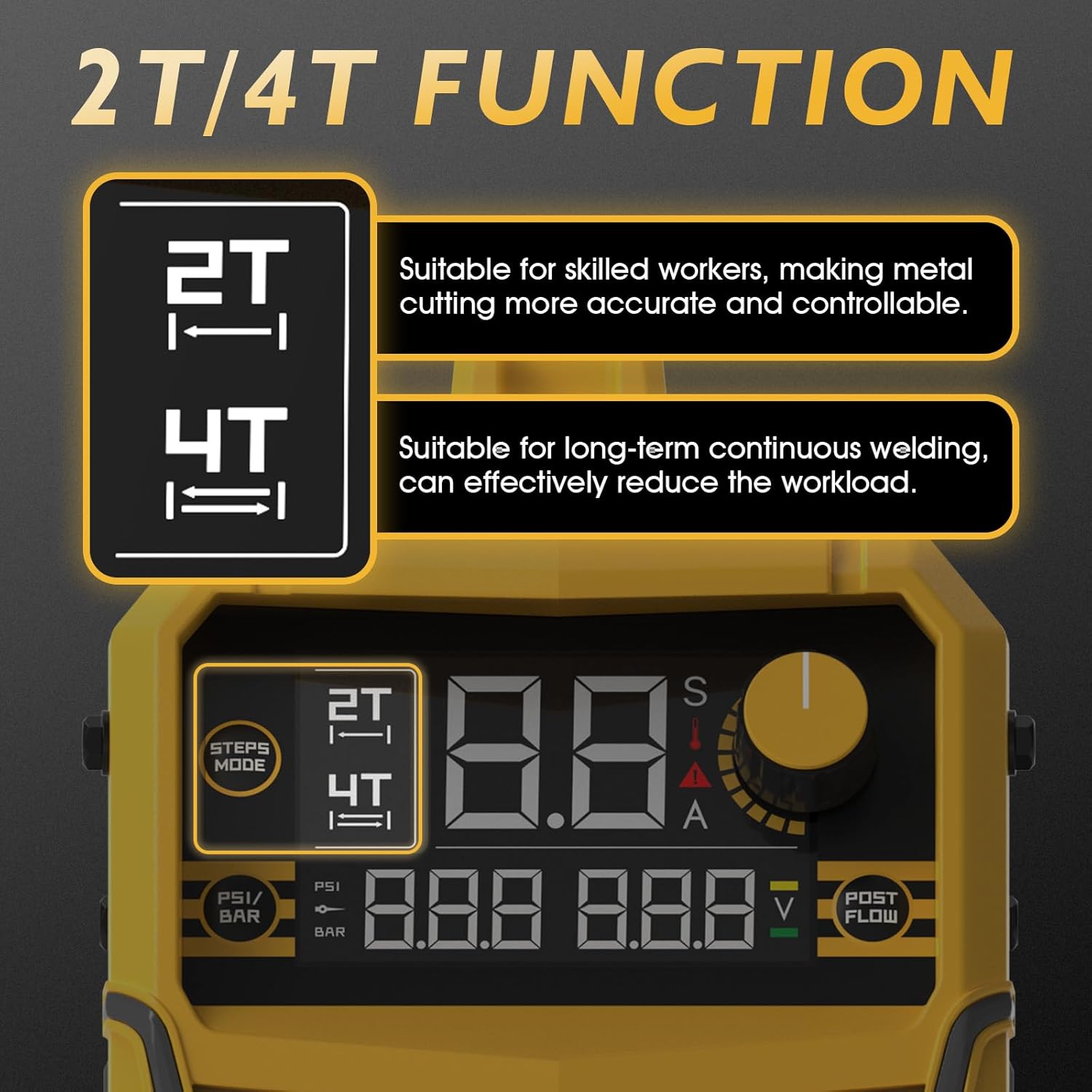 - 2T/4T FUNCTION: Rear time function with an adjustment range of 5-20 seconds. Post flow time to cool the weld head and extend the life of the weld metal. 2T/4T function selects automatic cutting to free your fingers, 2T for semi-automatic cutting control and 4T for fully automatic cutting control. Free your fingers for easy cutting