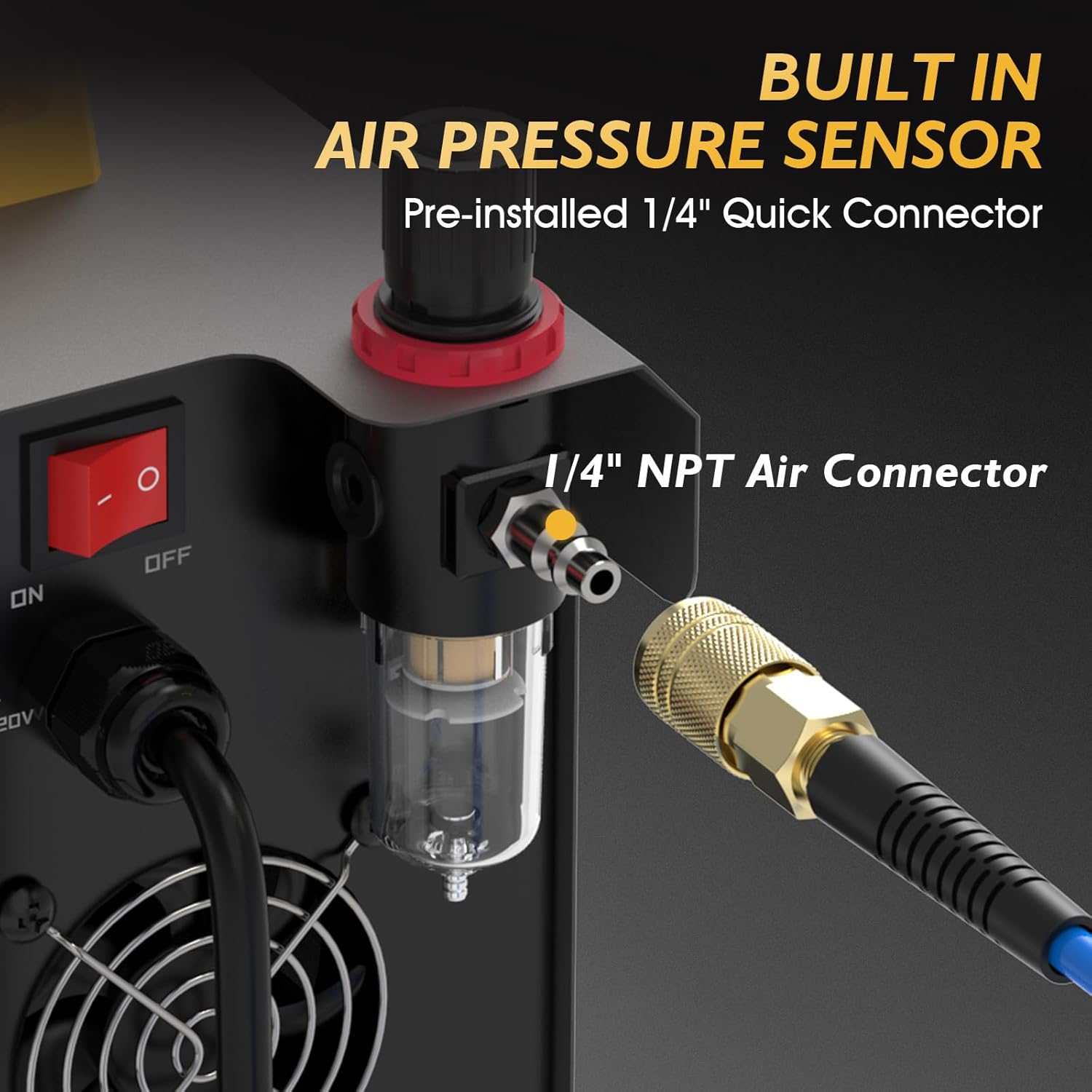 - Air Sensor Technology: The air sensor built into the machine will display the air pressure on the front panel of the machine. The back of the machine comes with a quick connect 1/4 NPT air connector air filter fitting and built-in regulator