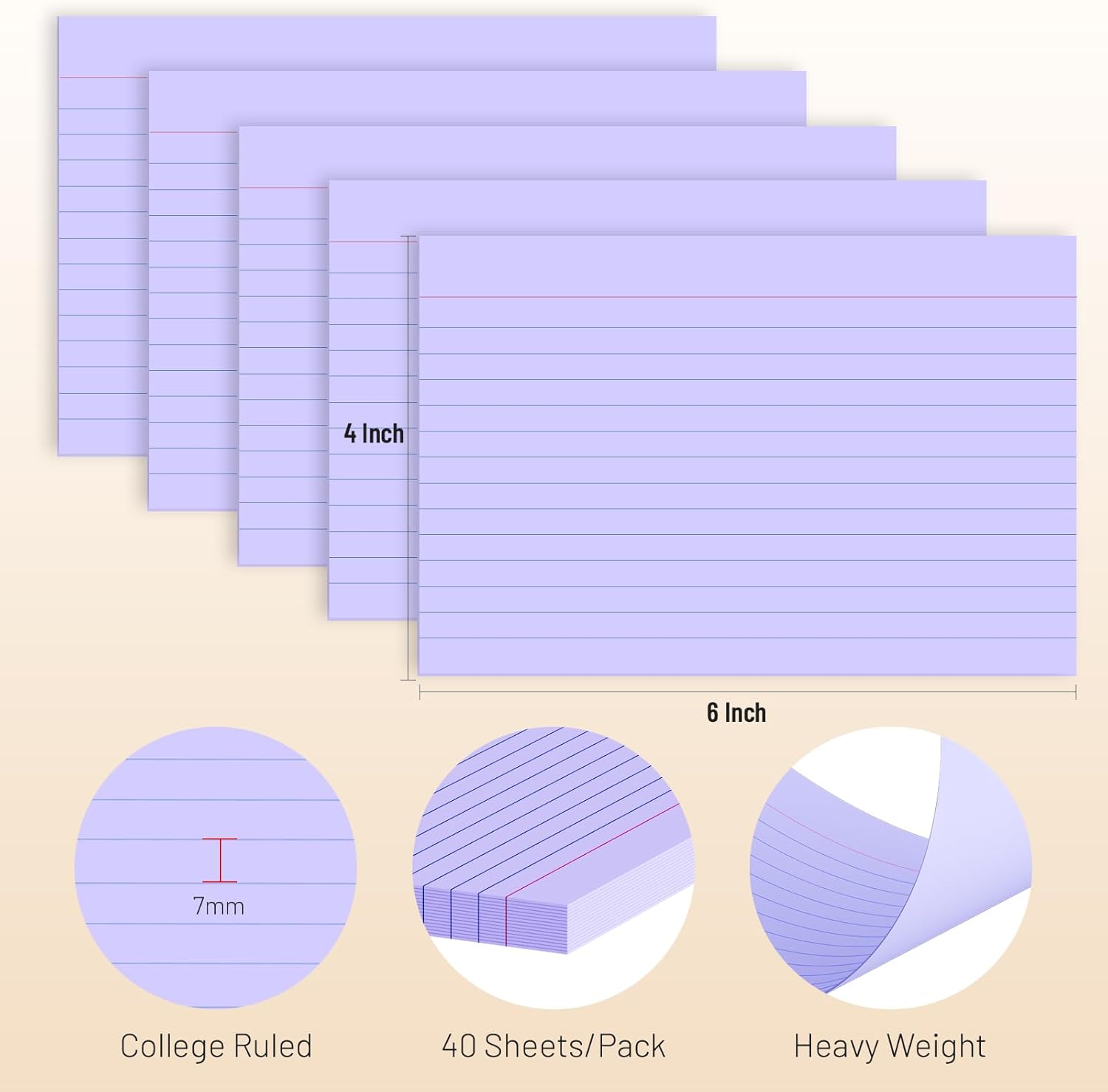 200 Pcs Index Cards 4 x 6 Inch Ruled Purple Index Cards, College Ruled Flash Cards for School, College, Office and Home Organization, Durable Study To Do List Note Cards with Ruled Lines, 5 Pack of 40