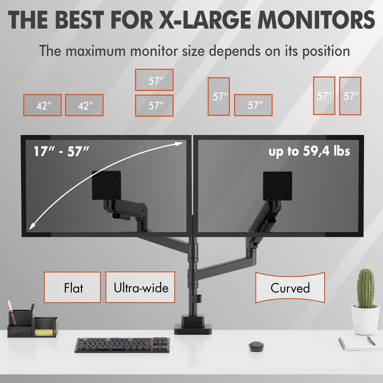 Dual Monitor Arm for 17-57 Inch Ultrawide Screens – Heavy Duty Monitor Arm Desk Mount – VESA Mount with Clamp and Grommet Base – Holds Up to 59.4 lbs. Each