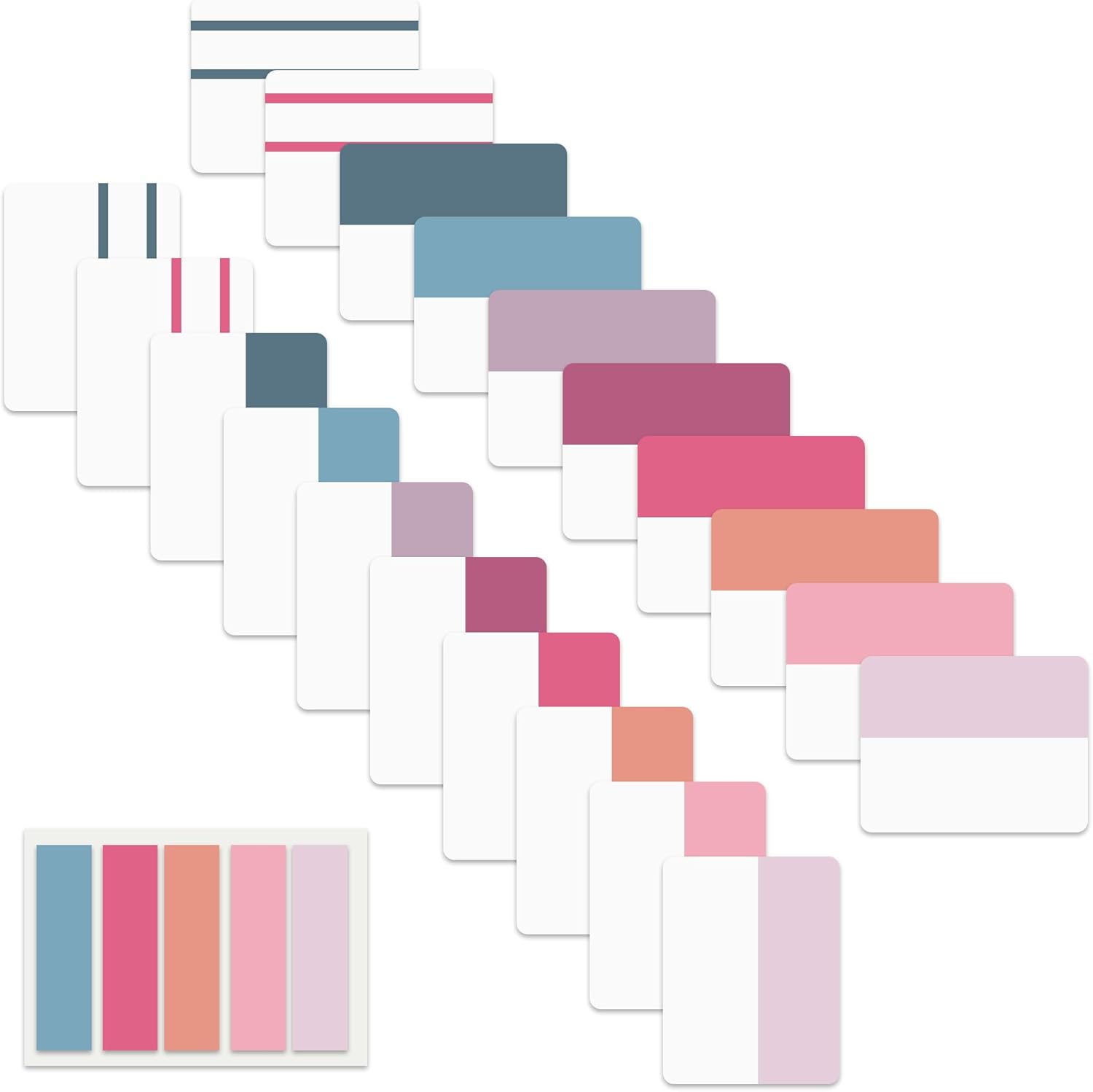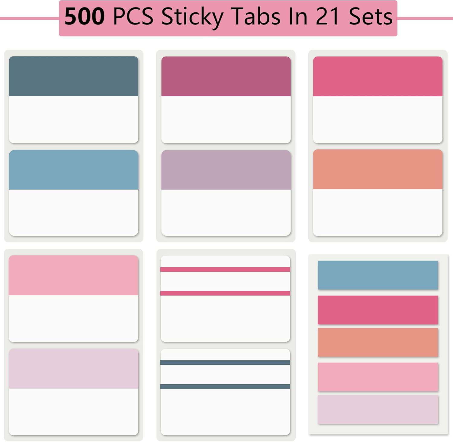 - Book Tabs: 500 pieces 21 sets in total, 400 pieces 2 inch sticky tabs in 20 sets with 10 different pastle colors,100 pieces 0.5 in tabs in 1sets, 20 pieces each color