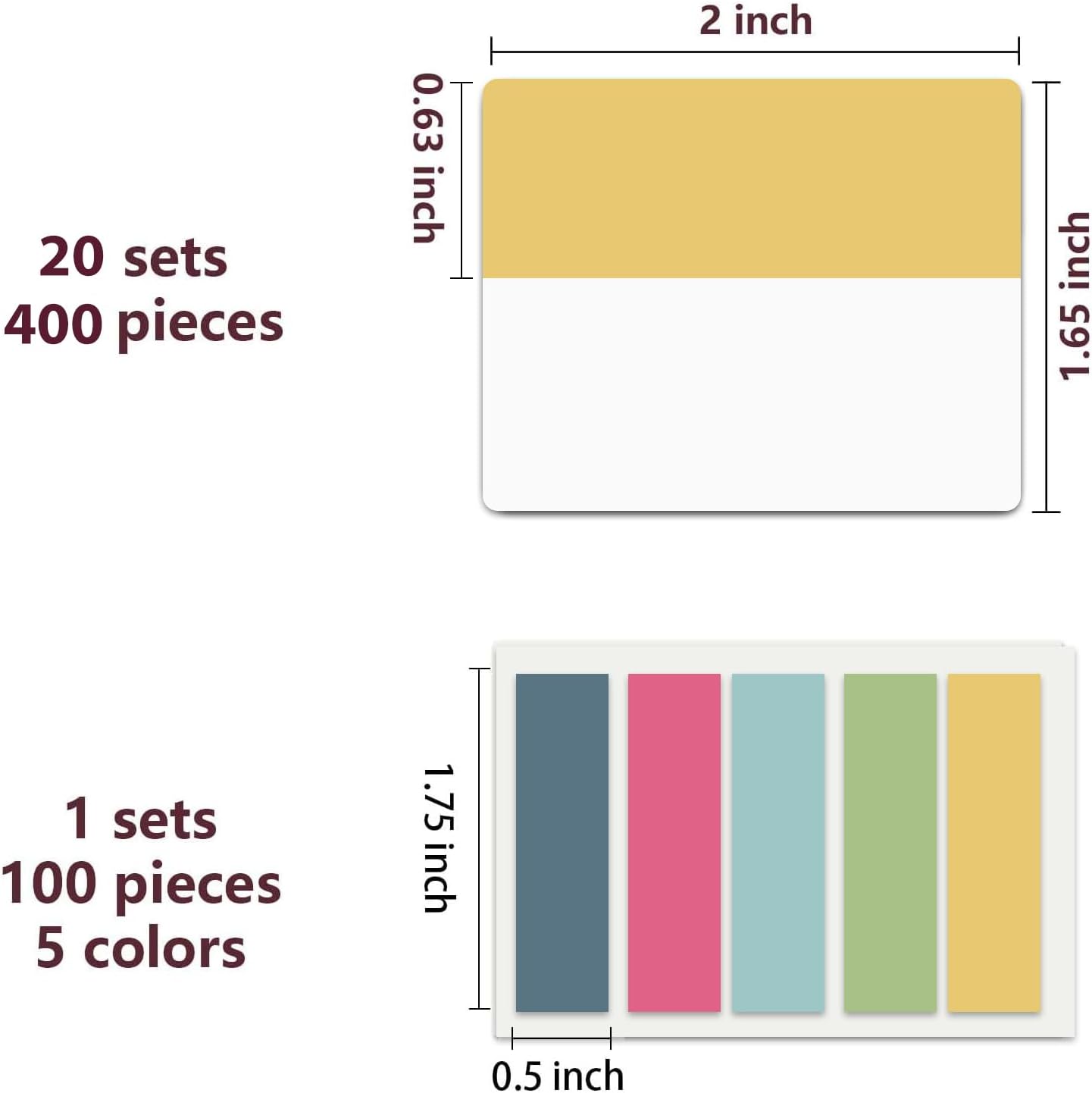 - 500 pieces Tabs: 500 pieces 21 sets in total, 400 pieces 2 inch sticky tabs in 20 sets with different pastle colors,100 pieces 0.5 in tabs in 1sets, 20 pieces each color