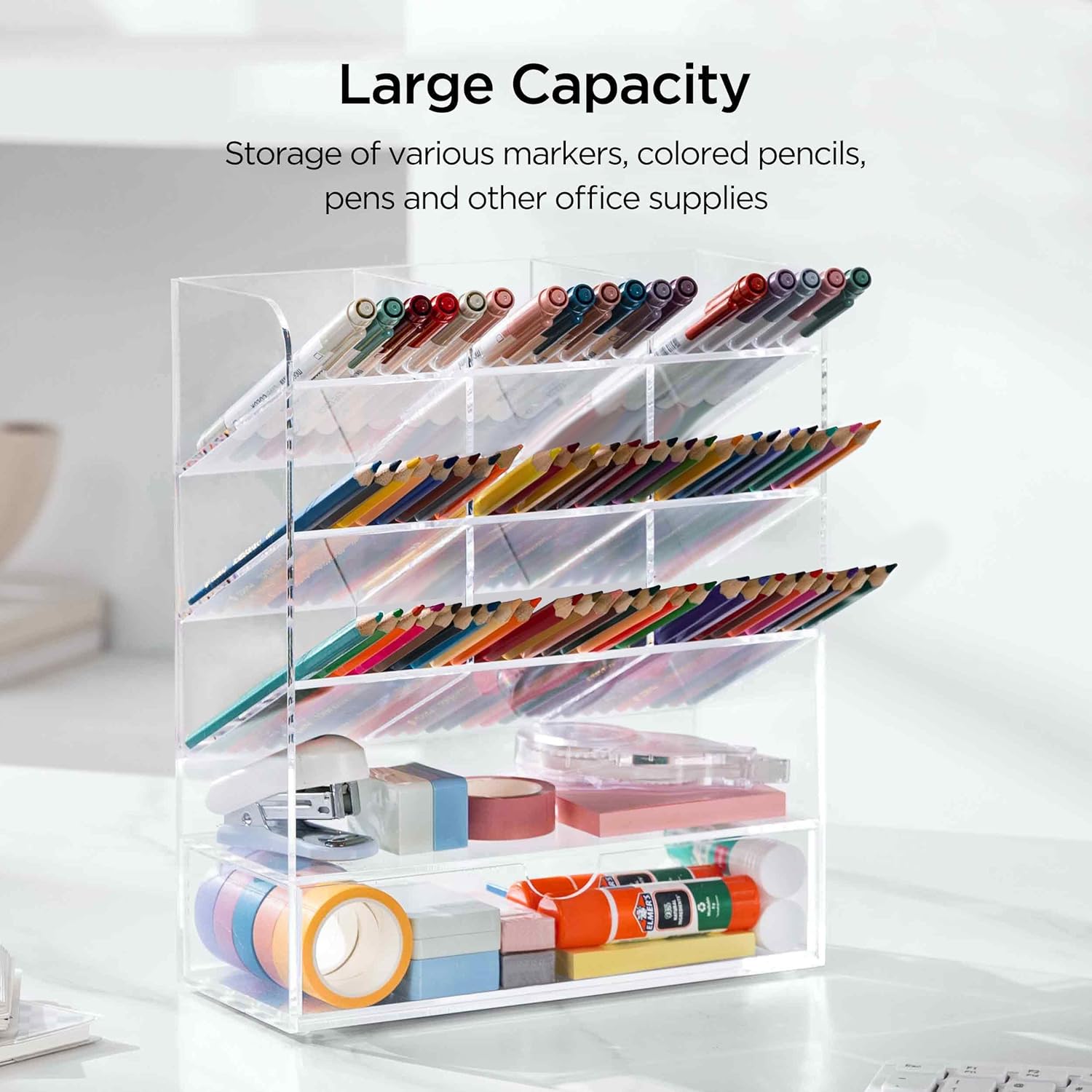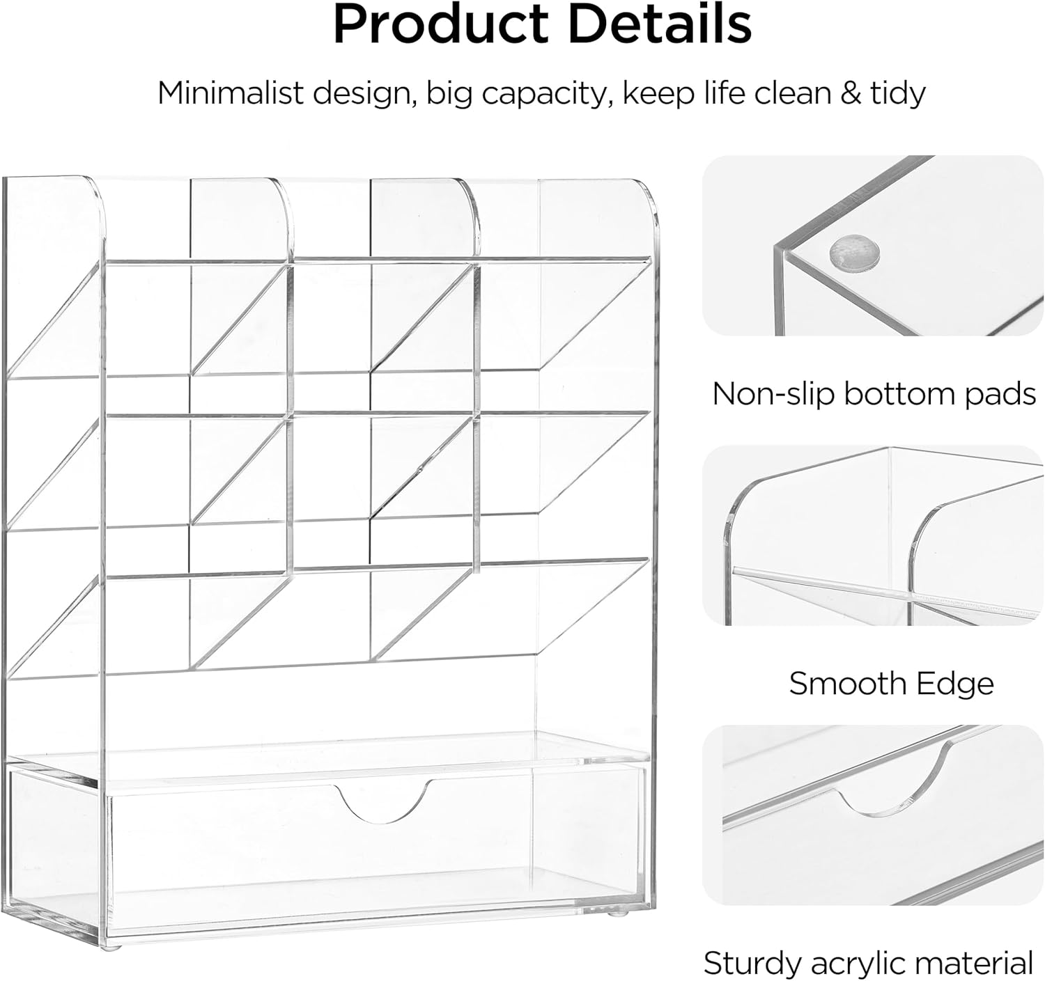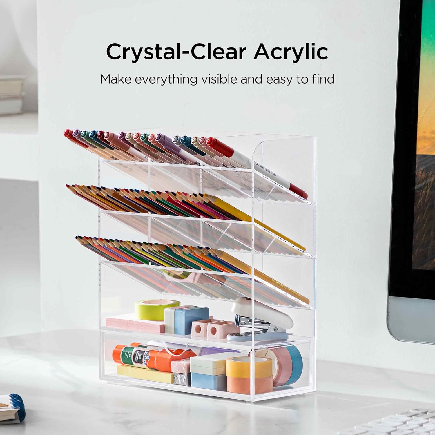 - 【Crystal-Clear Acrylic】: Unlike flimsy mesh desk organizers, this acrylic pencil display holder for desk resists bending and deformation. Its smooth surface is stain-resistant and easy to clean with a damp cloth. The durable construction maintains structural integrity over time, combining practicality with a sleek, modern aesthetic.