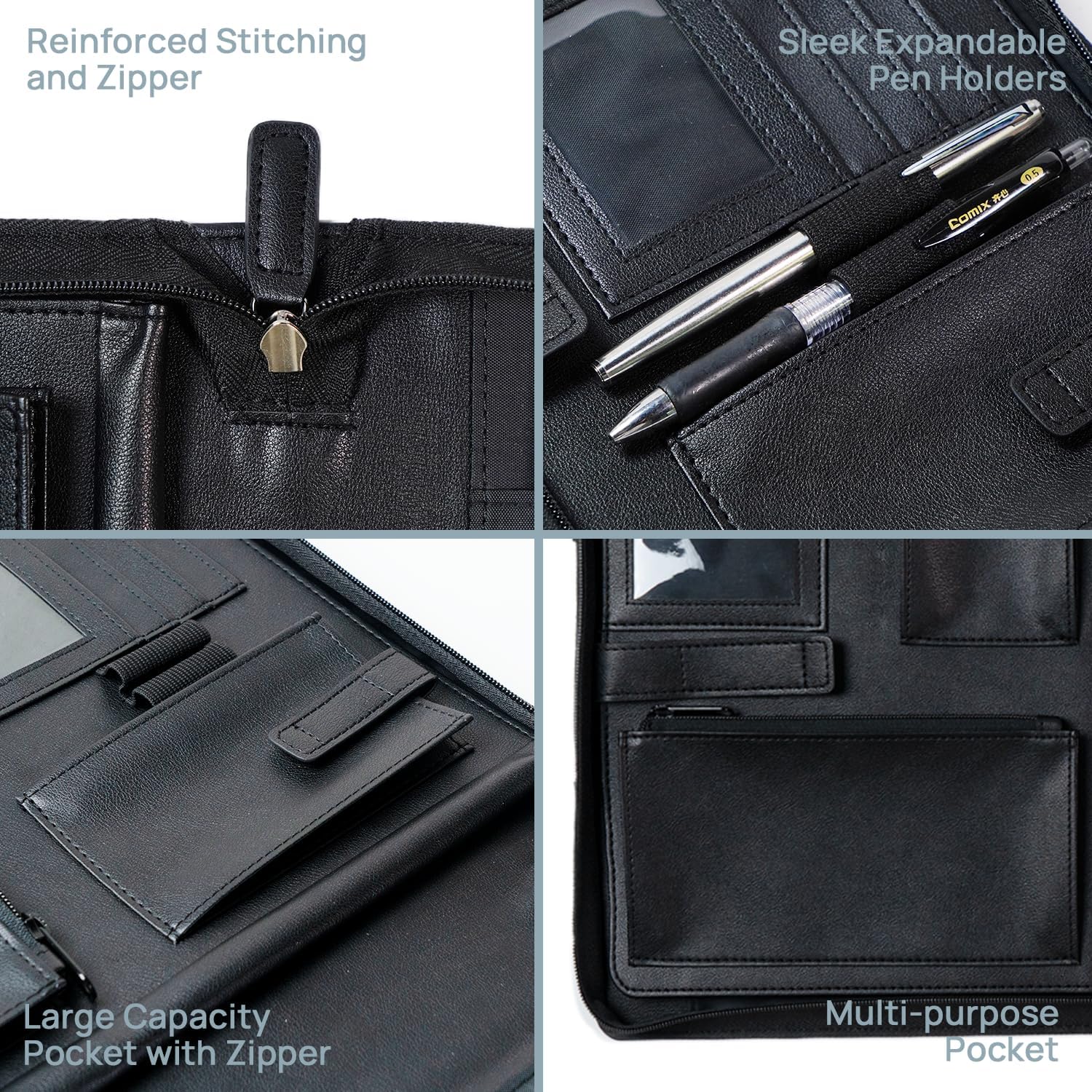 POPRUN Portfolio Binder with Zipper, Leather Padfolio Document Organizer with Storage, Professional Business Briefcase ideal for Meeting Presentation Work-Includes 50 Sheet Writing Pad, Black