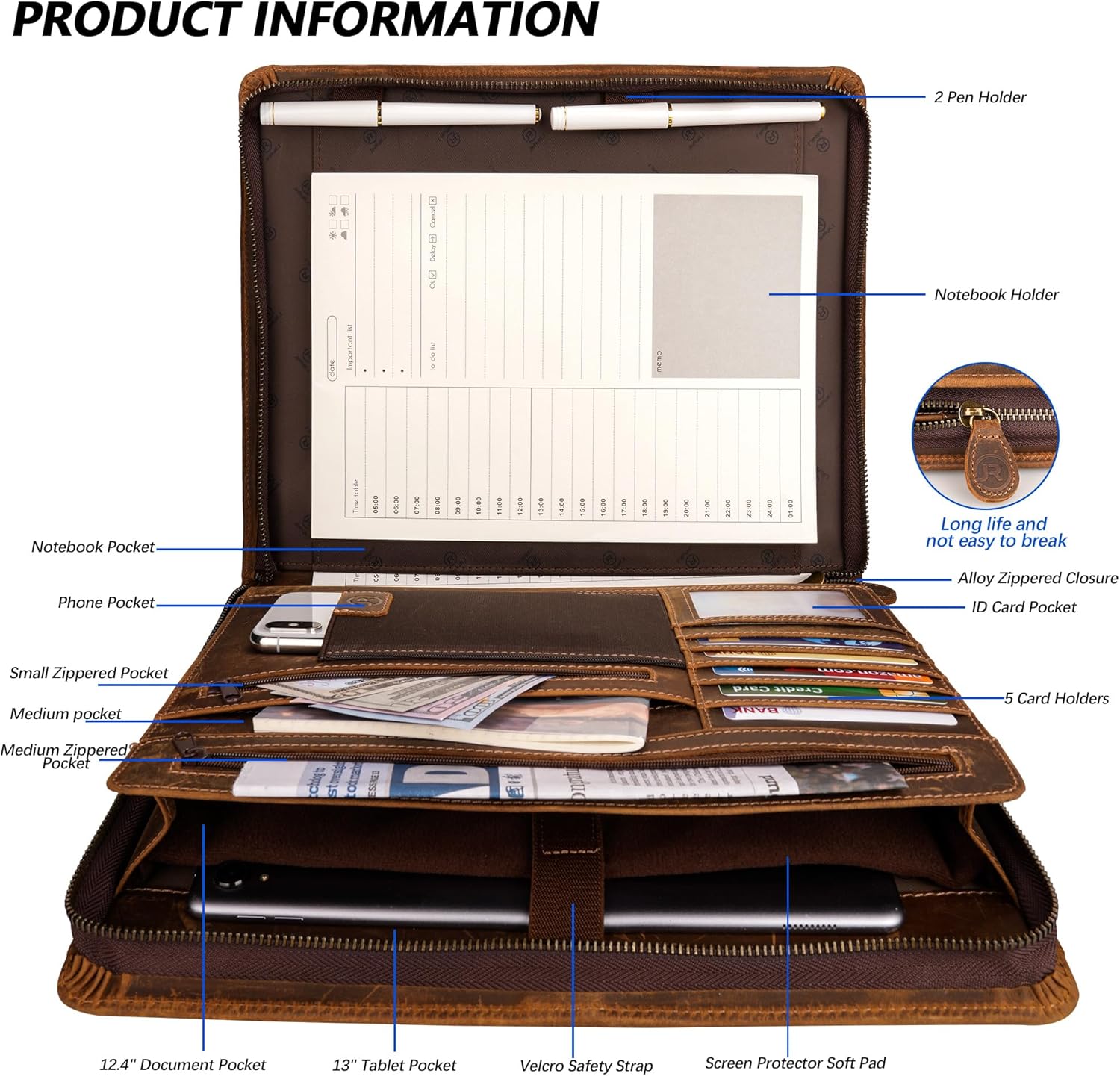 - Multi-Function Business Organizer: Designed for maximum productivity with multiple storage compartments including dedicated slots for business cards, documents, A4 notepad, and a secure tablet/iPad pocket (fits up to 13"). The professional padfolio features a document sleeve, zippered pocket for valuables, and an elegant pen loop for your executive pen.