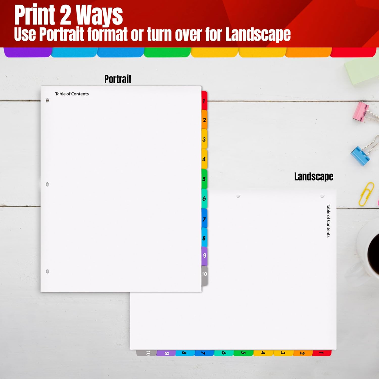 Tab Dividers for 3 Ring Binders – 6 Sets, 1–10 Numbered Index Dividers with Table of Contents – 8.5 x 11 in, 3-Hole Punched – Binder Dividers for School, Office, Filing, Organizing - 6 Pack
