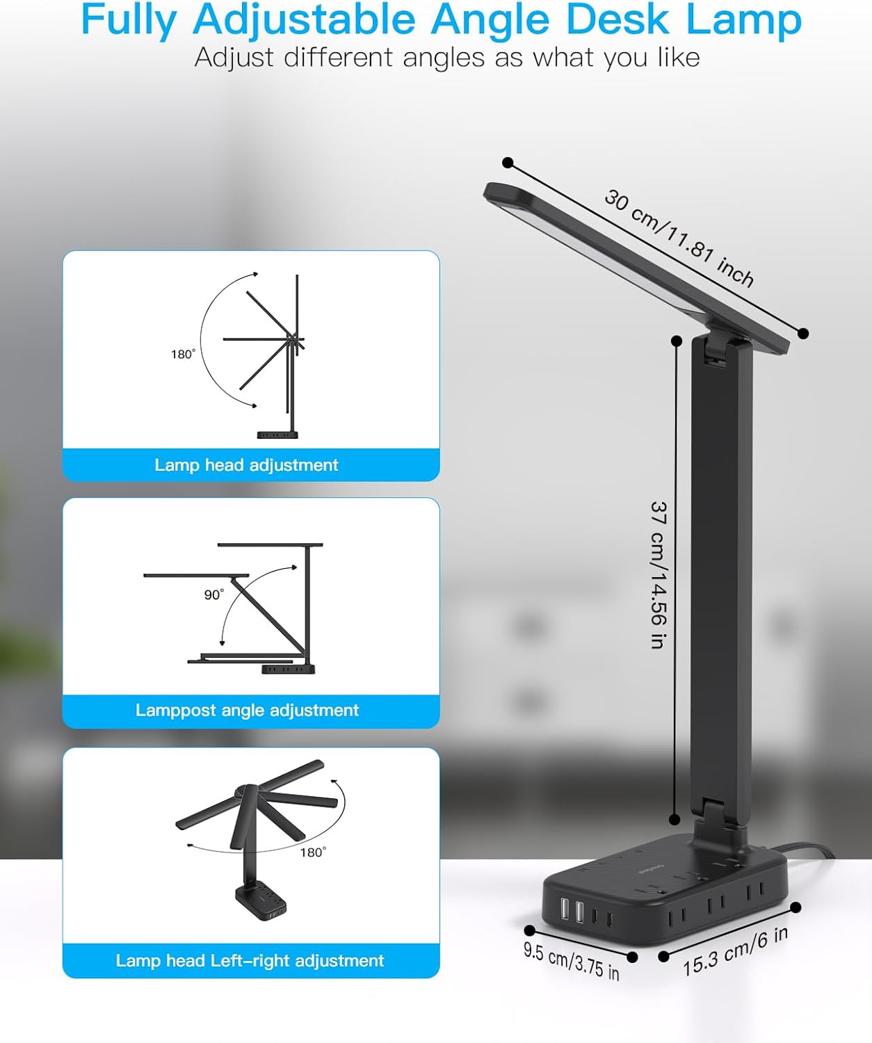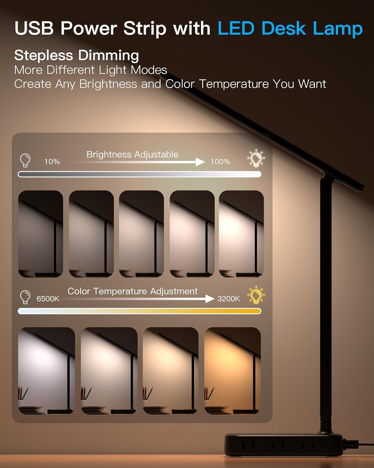 - 【10-IN-1 Deskop Power Strip with USB Ports 】The small desk lamp for college dorm room is also equipped with 2 USB-C port, 2 USB-A ports and 6 AC outlets(Rating:125V 60Hz 15A 1875W MAX), making your phone, tablet, kindle, watch, humidifier and other electronic devices are charged whether the lamp is on or off, building your own working station. Fully save your time and space.