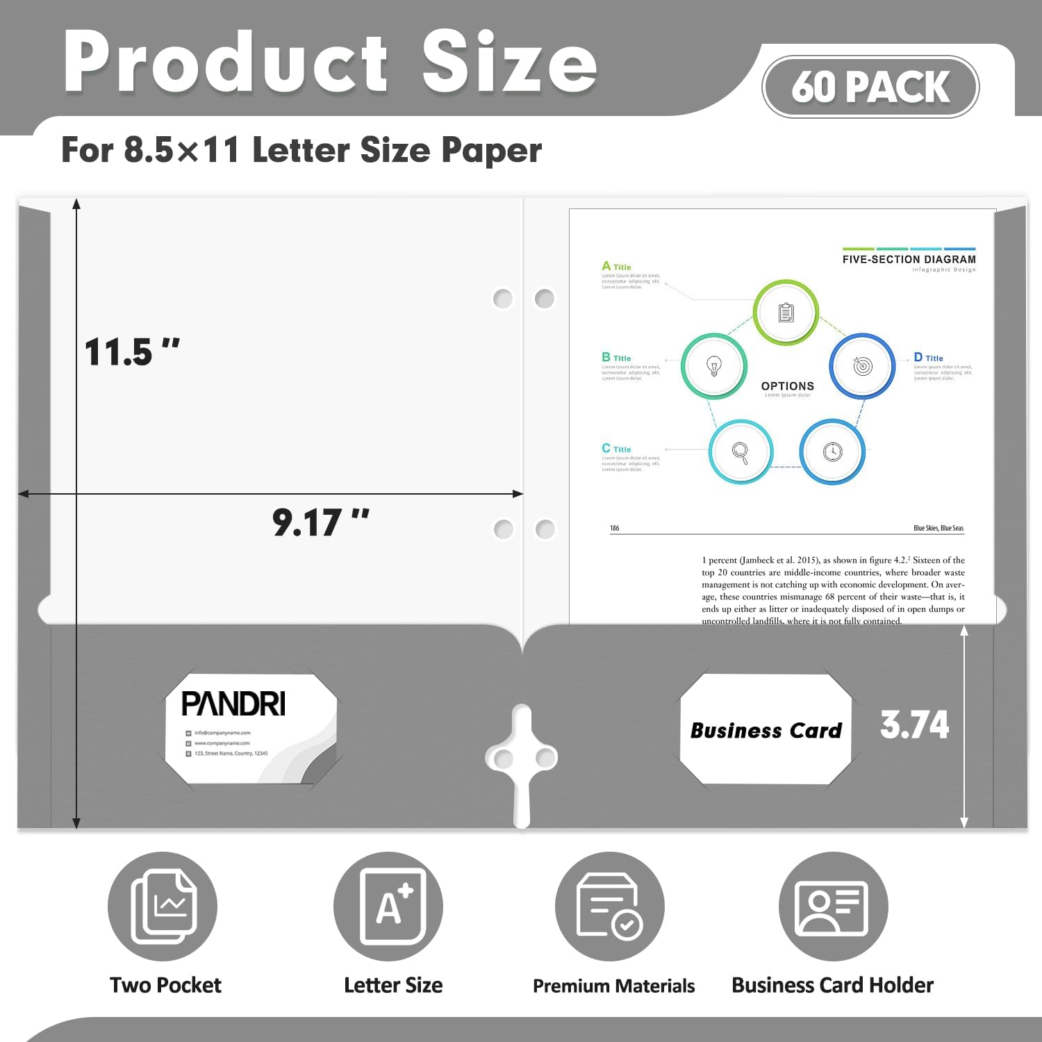 Two Pocket Portfolio Folders, PANDRI 60 Pack 3 Hole Punched 2 Pocket Folders for 3 Ring Binder, Letter Size Paper File Folder for School Office Home Business, Grey