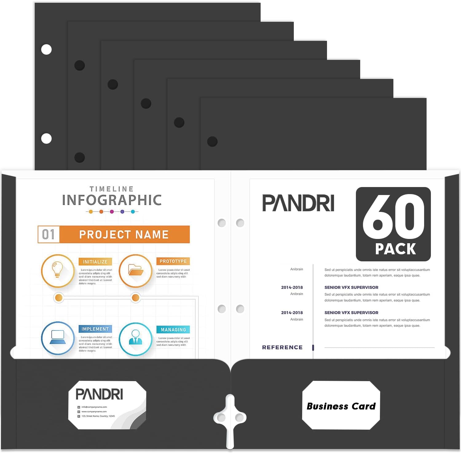 Two Pocket Portfolio Folders, PANDRI 60 Pack 3 Hole Punched 2 Pocket Folders for 3 Ring Binder, Letter Size Paper File Folder for School Office Home Business, Black