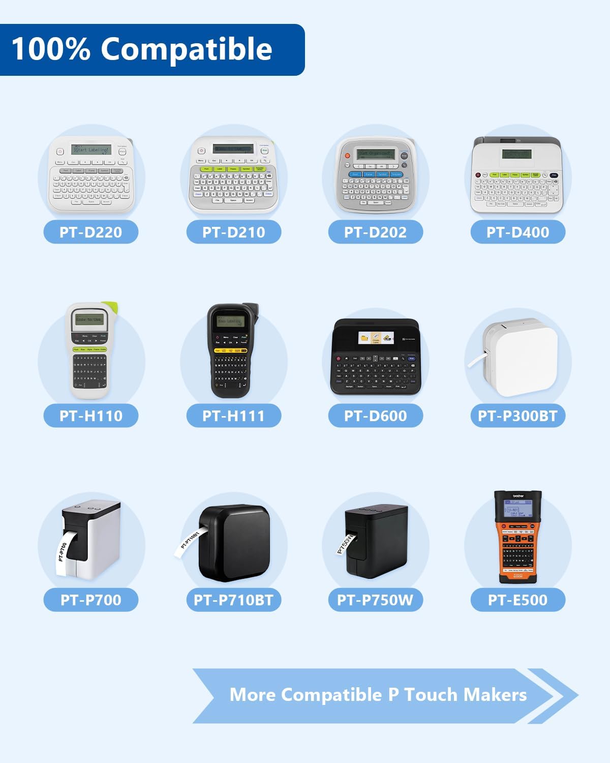 - Compatible with Brother Ptouch Label Maker: PT-D210, PT-D220, PT-D200, PT-H110, PT-D400, PT-D600, PT-H103W, PT-2040, PT-1280, PT-1290, PT-P710BT, PT-D410, PT-D400AD, PT-D460BT, PT-D610BT, PT-1230PC, PT-1890C, PT-1890w, PT-D600VP, PT-2730VP, PT-D201, PT-D202, PT-D215e, PT-E105, PT-E110, PT-E300, PT-H111, PT-P300BT, PT-310BT, PT-1880C, PT-1880SC, PT-1880W, PT-1890, PT-D450, PT-P700, PT-P715eBT, PT-P750W, PT-P910BT, PT-9700PC, PT-2040W, PT-2040SC, PT-2040C, PT-2430PC, PT-2300, PT-E500, PT-E550W, PT-1280SR, PT-2030AD, PT-P910BT, PT-9600, PT-1090 ect
