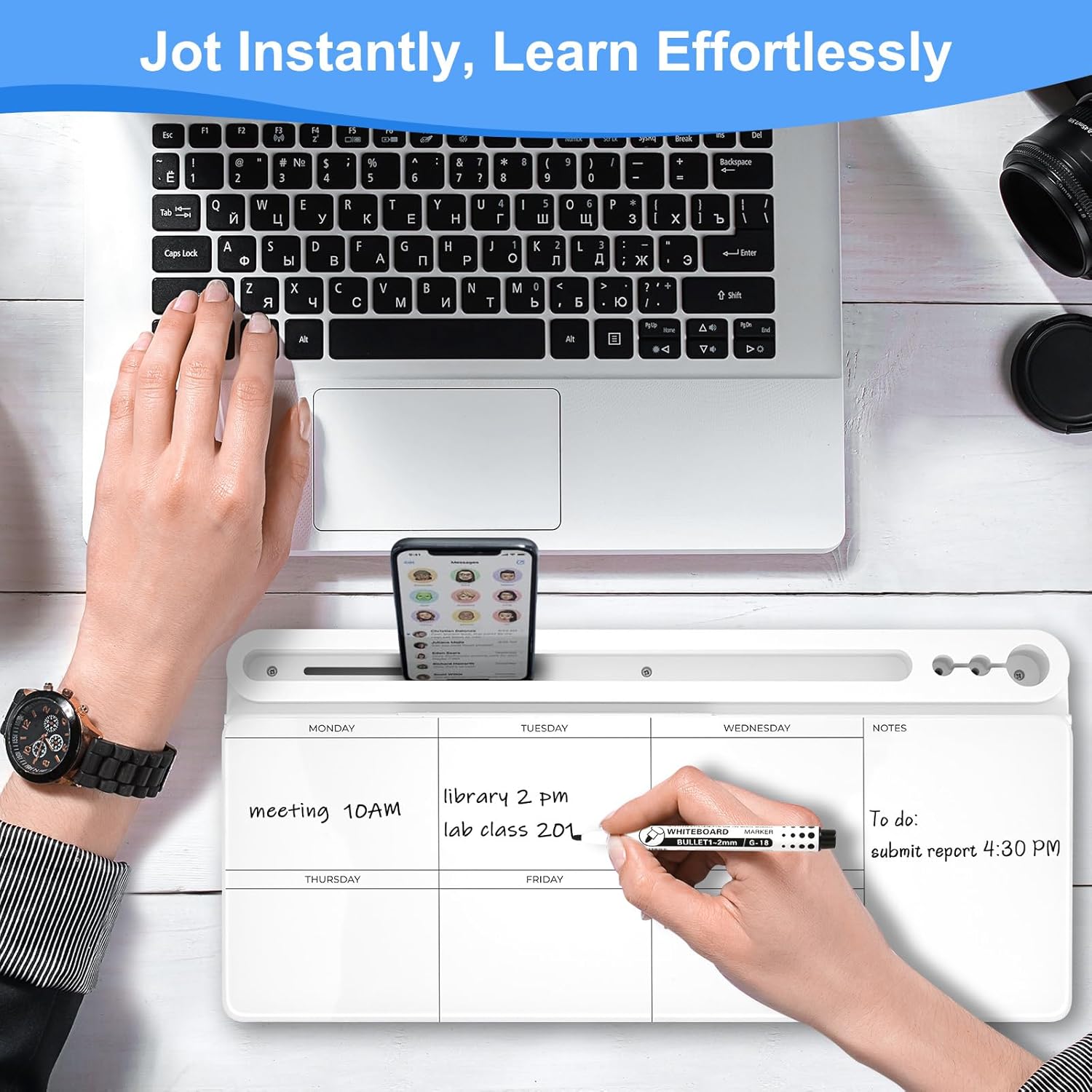 - Weekly Planner Whiteboard - Stay on top of your weekly schedule with ease using our desktop whiteboard. It features a weekly grid with clearly defined sections for each day and notes. Crafted from tempered glass, it offers a smooth writing experience and effortless clean-up—no stains, no scratches. Perfect for organizing tasks, writing to-do lists, and taking quick reminders.