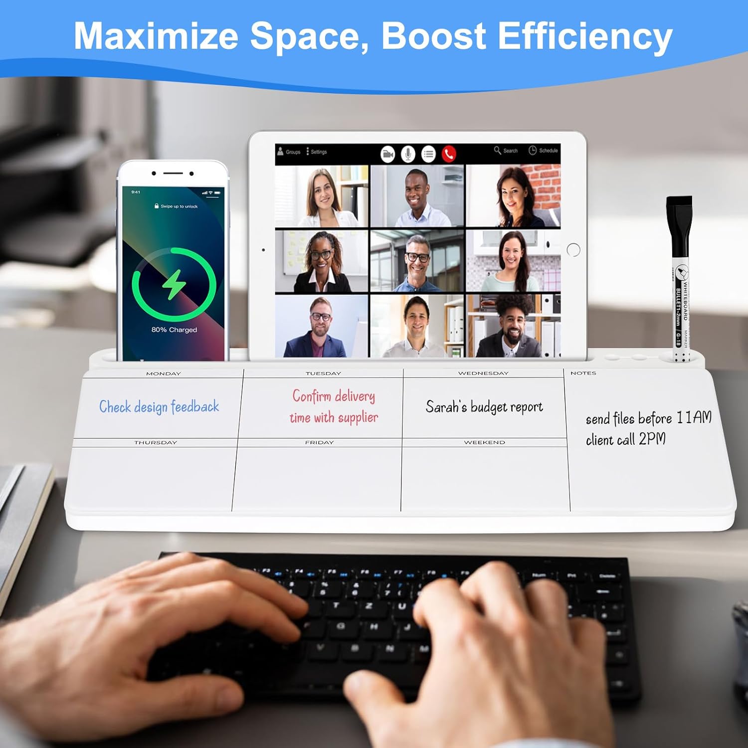 - Multiple Functions - To enhance the overall convenience of the product, this whiteboard includes 1 large pen holder, 2 small pen holders and 1 slot on the top which can hold 3 markers, a tablet and a phone. Equipped with charging port notch in the slot, the desk board is a good option to realize office charging, and you can charge your phone quickly. This dry erase board is more ergonomic with the perfect ramp design and non-slip design, which can make itself be used as keyboard pad.