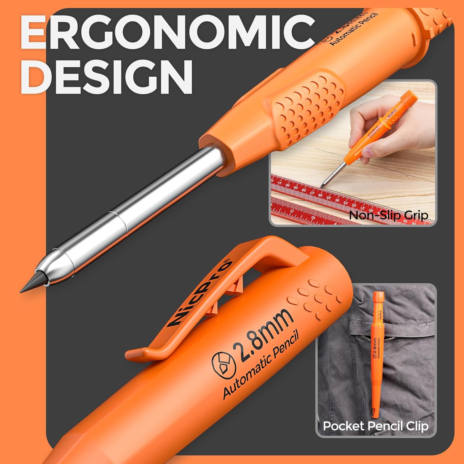 Nicpro CP3000 Carpenter Pencil with Sharpener, 2.8mm Mechanical Pencils with 19 Refill, Deep Hole Marker for Construction, Heavy Duty Woodworking Pencil, Carpenter Tools for Architect Marking (Orange)
