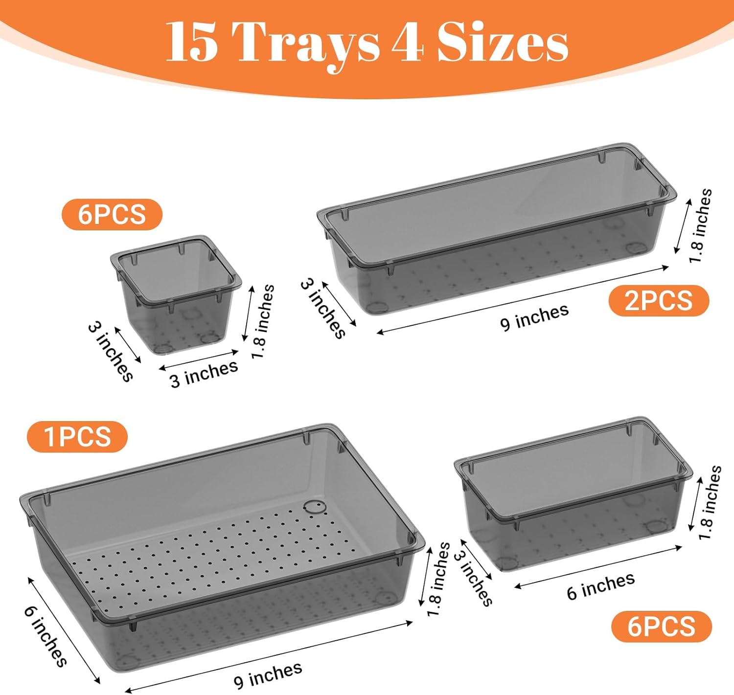 - 4 Different Combinations of Sizes: The clear drawer organizer includes 15 storage bins of 4 different sizes: 9 x 6 x 1.8 inches (1 pcs), 9 x 3x 1.8 inches (2 pcs), 6 x 3 x 1.8 inches (6 pcs), 3 x 3 x1.8 inches (6 pcs)