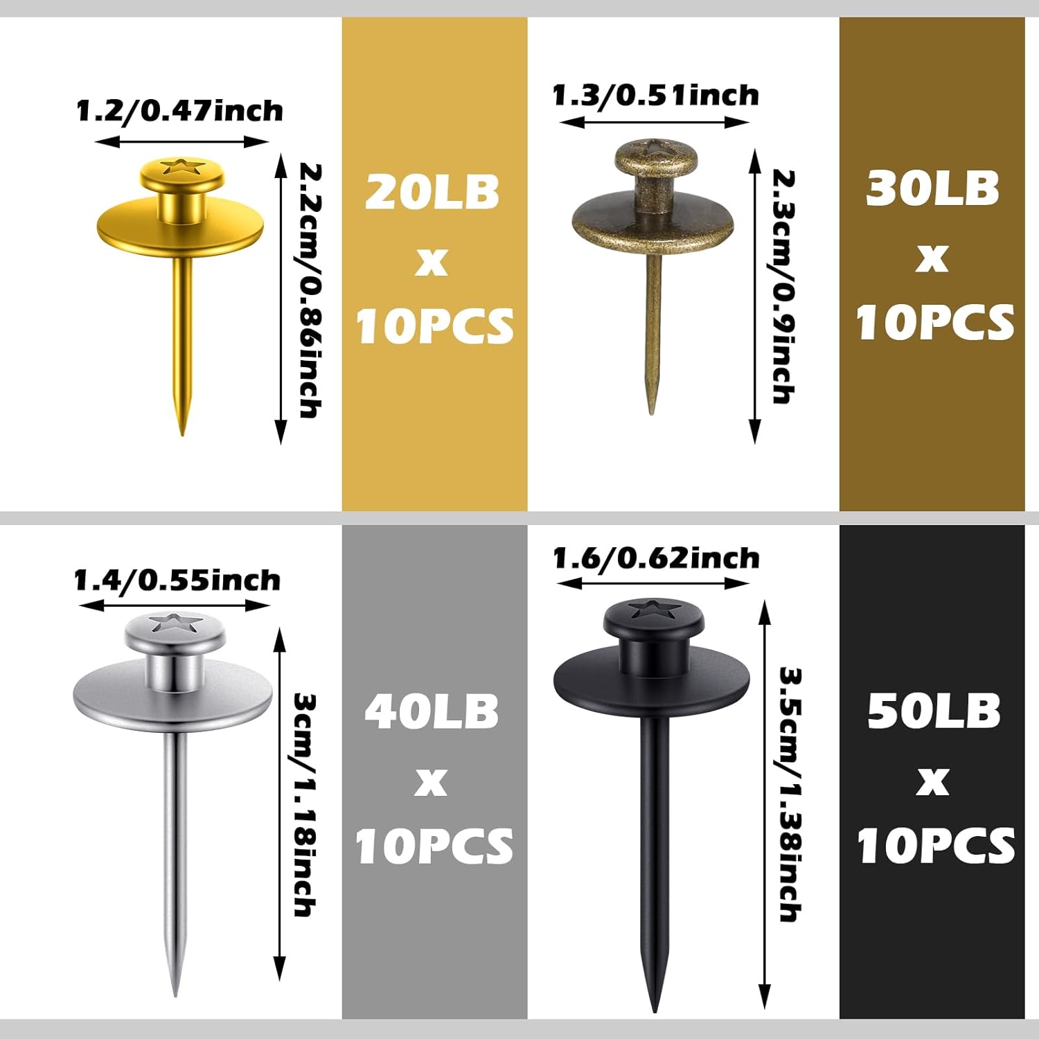 - Diverse Weight Bearing to Choose: you will receive 40 picture frame nails, 4 different load-bearing and colors, namely 10 gold 20 lb, 10 bronze 30 lb, 10 silver 40 lb, 10 black 50 lb, which allow you to choose different bearing nails according to the needs of hanging pictures, bringing you a pretty convenience; Sufficient quantity and different bearing can meet your various needs