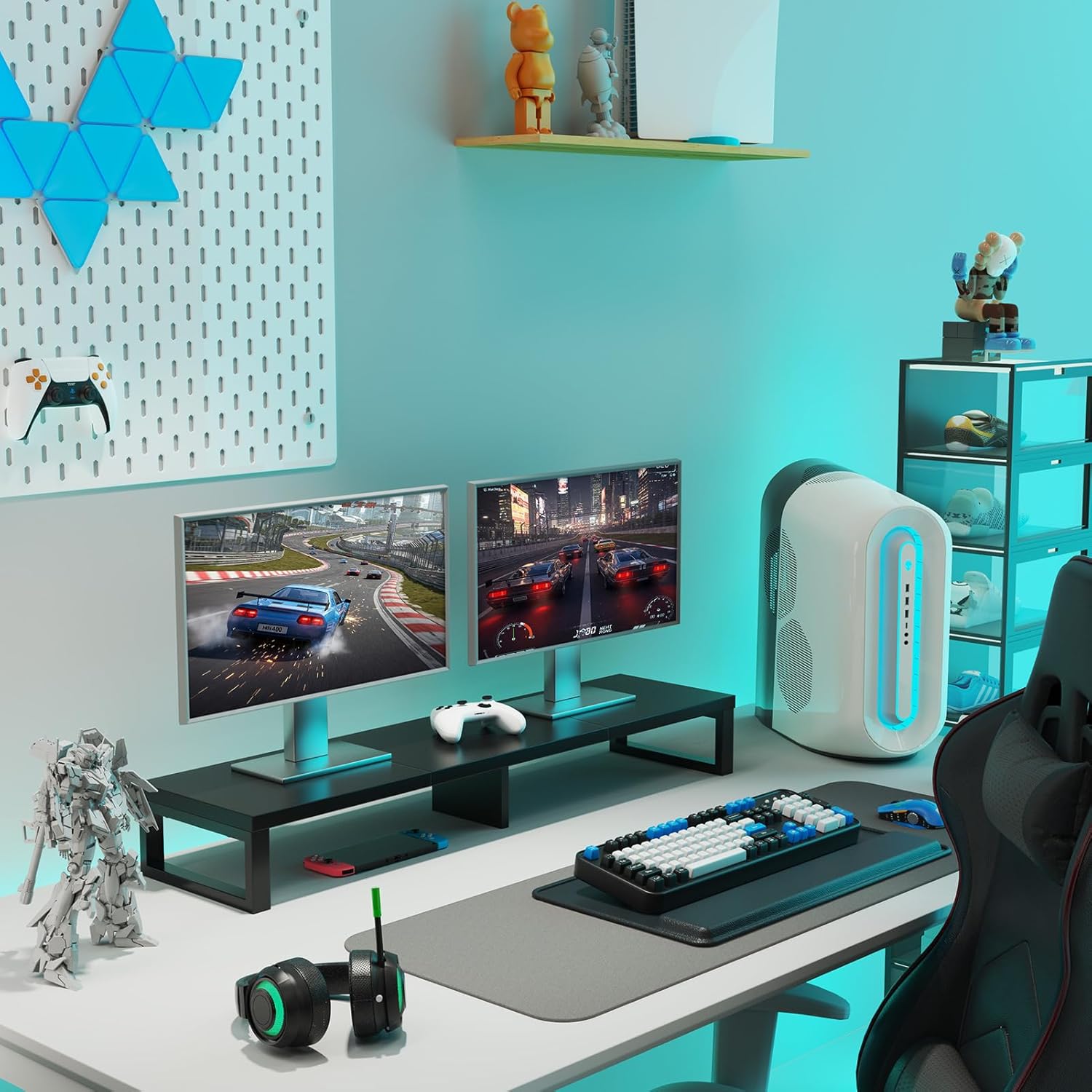- Spacious Storage Underneath: This dual monitor stand riser hides full-size keyboards (up to 18.8"), mice, and office gear in its sleek undercarriage storage – essentials stay accessible while clutter disappears.