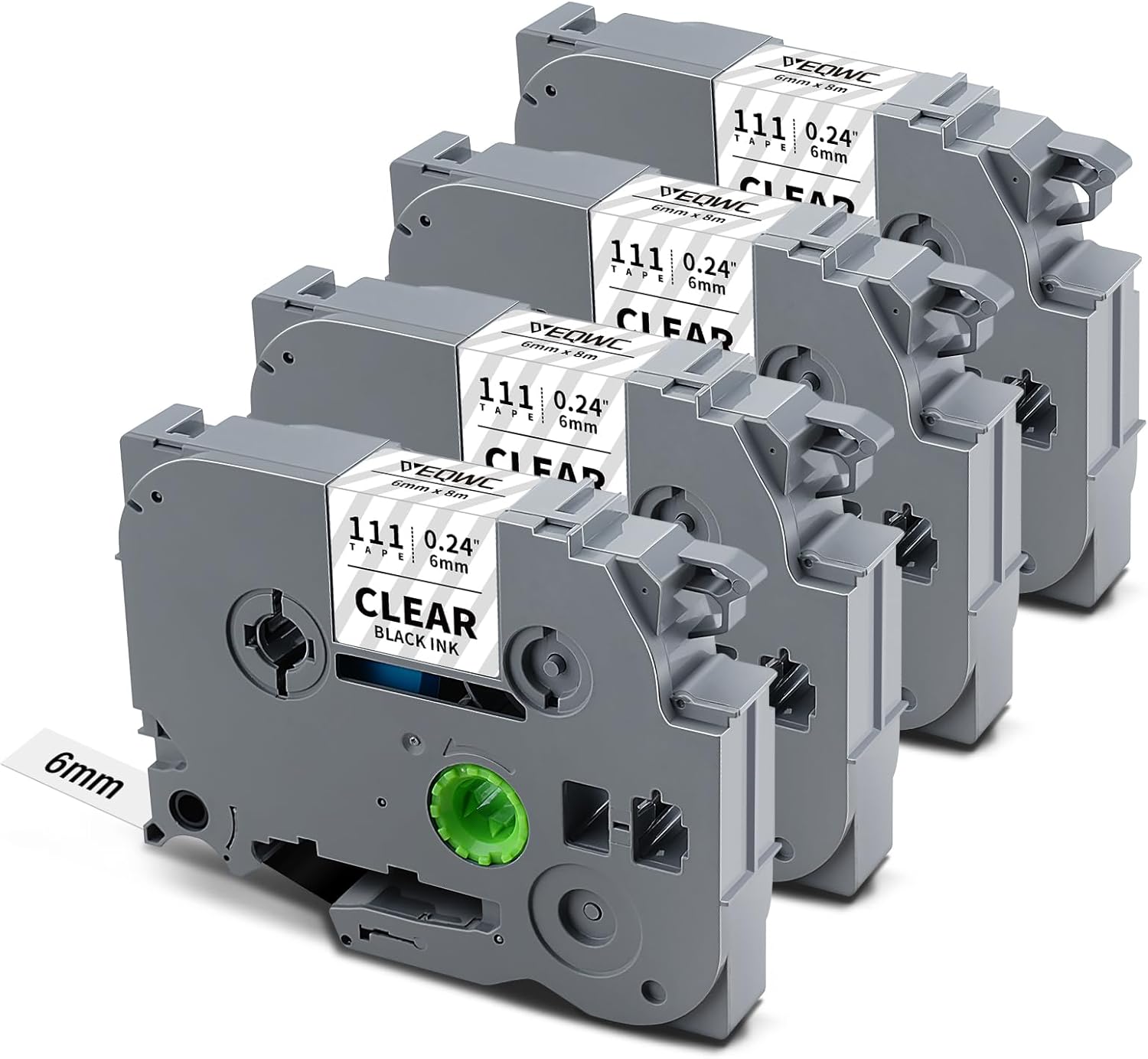 6mm 0.23 Laminated Clear Label Tape Tz-111 TZ Tape Compatible for Brother P-Touch Tze-111 1/4" Tze Label Refills Work for Ptouch Label Maker PT-D220 PT-D210 PT-H110 PT-D400, Black on Clear, 4-Pack