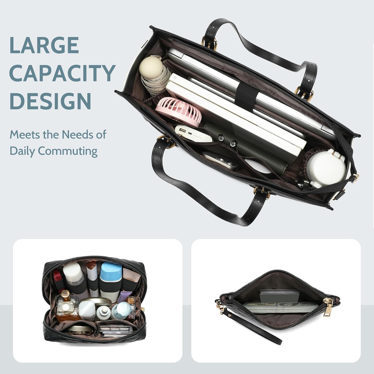 - 【Large Capacity Laptop Bag】:Size of womens laptop bag:16"L x 11.5”H x 5.8”D.Also includes 1 x makeup bag and 1 x clutch purse is compact enough to fit in your phone, wallet, makeup, passport, etc.The dedicated laptop compartment provides maximum protection for your Computer.