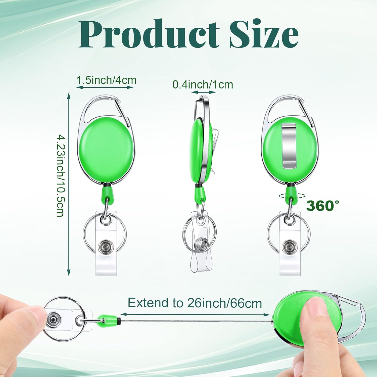 - Size: retractable keychain size is 4.13 x 1.57 inch/ 10.5 x 4 cm, designed with a retractable cord, can extend up to 26 inch/ 66 cm long, the retraction mechanism is very smooth, will not get stuck, and not easy to break, easy to enter and exit various places