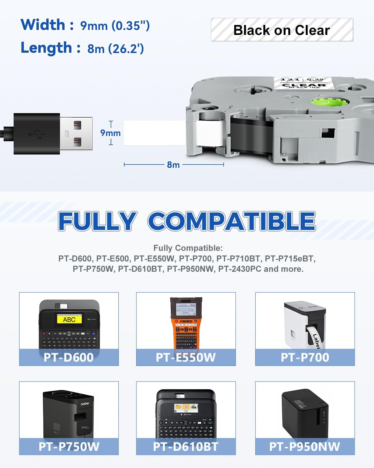 - Widely applicable: These 9mm 0.35" laminated clear label tapes are suitable for indoor and outdoor use. Compatible with Brother 9mm 0.35" black on clear label tape can be used to label various items such as home, office, industrial, supermarket, school, and other supplies