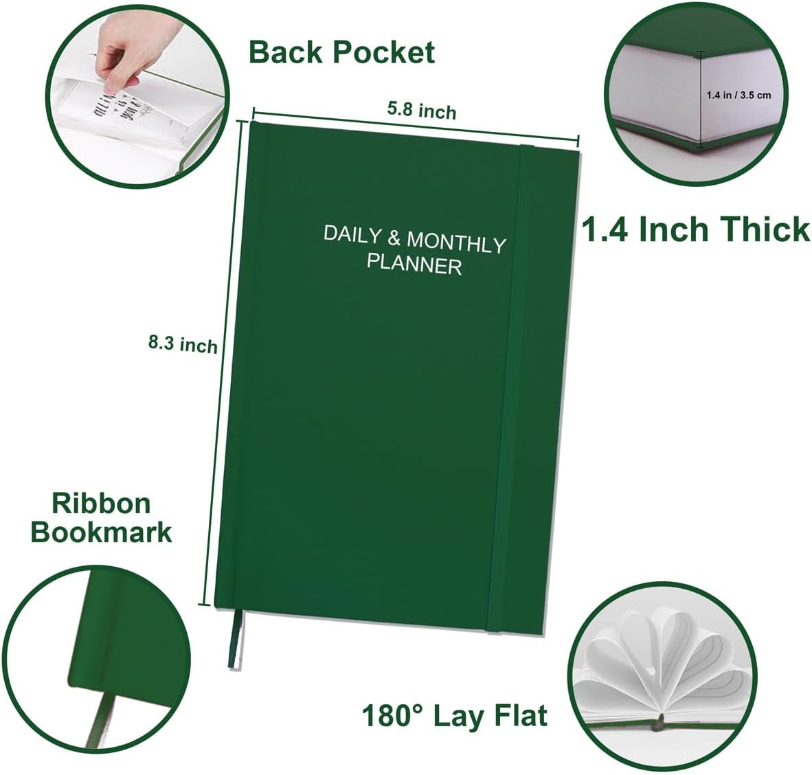 Daily & Monthly Planner for 2025 2026 or Anytime - ADHD Planner Two Pages Per Day, Daily Planner Undated to Increase Focus, Eliminate Overwhelm, Achieve Your Biggest Goals, 5.8'' × 8.3'', Green