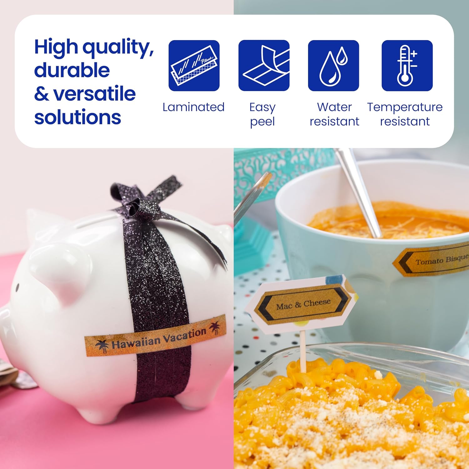 - POWERFUL 7-LAYER LAMINATION: Patented technology reinforces & protects the surface of labels; thinand remarkably durable labels are almost indestructible; text and glitter are printed between layers forprotection against illegibility and wear & tear